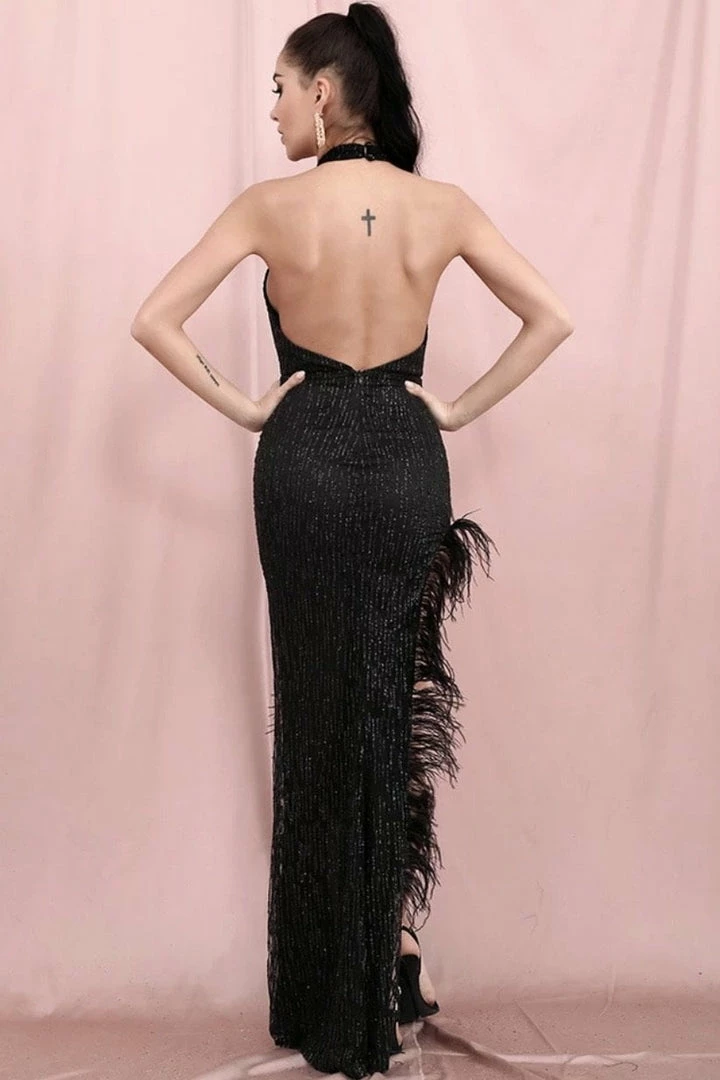 Dazzle all night long in this stunning piece! Featuring a sequin material, high neckline, high leg slit, feather details, bodycon fit, and a floor length.