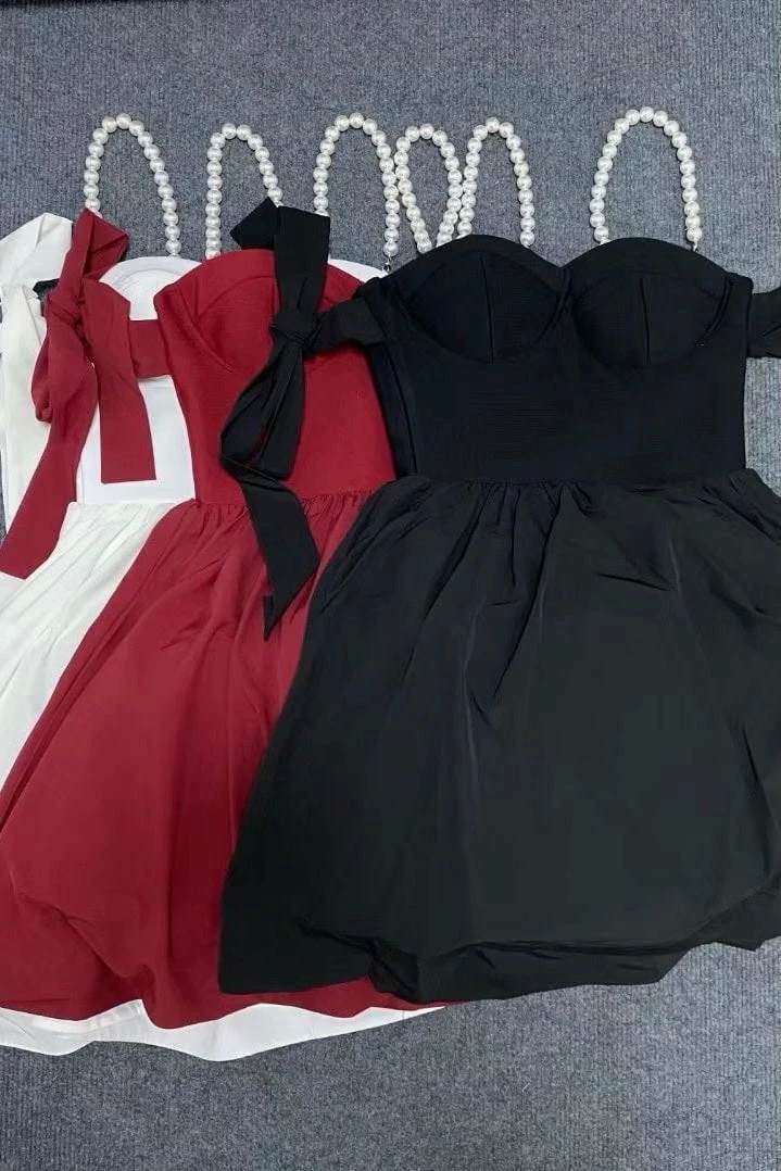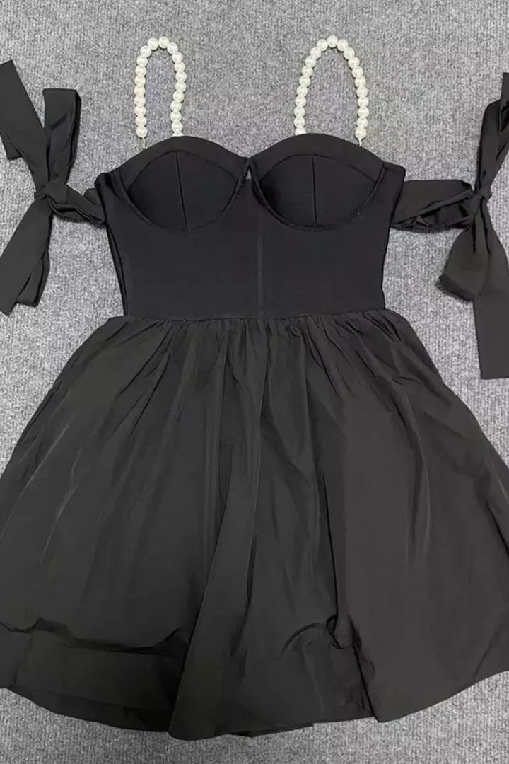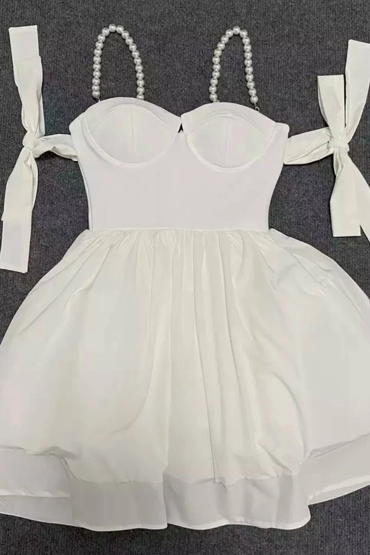 Look like a total doll at your next event! This mini dress featured tied off the shoulder straps, a pearl strap, a bustier style top, and an A-line fit. Style with ankle strap heels and a mini clutch and head to dinner and a show!