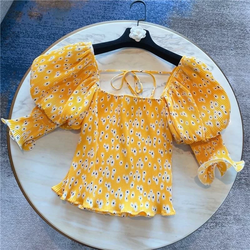 Look super feminine and trendy in this gorgeous top. Featuring puff short sleeves, floral material, and a cropped length. Pair with white denim jeans and wedges for a cute look.