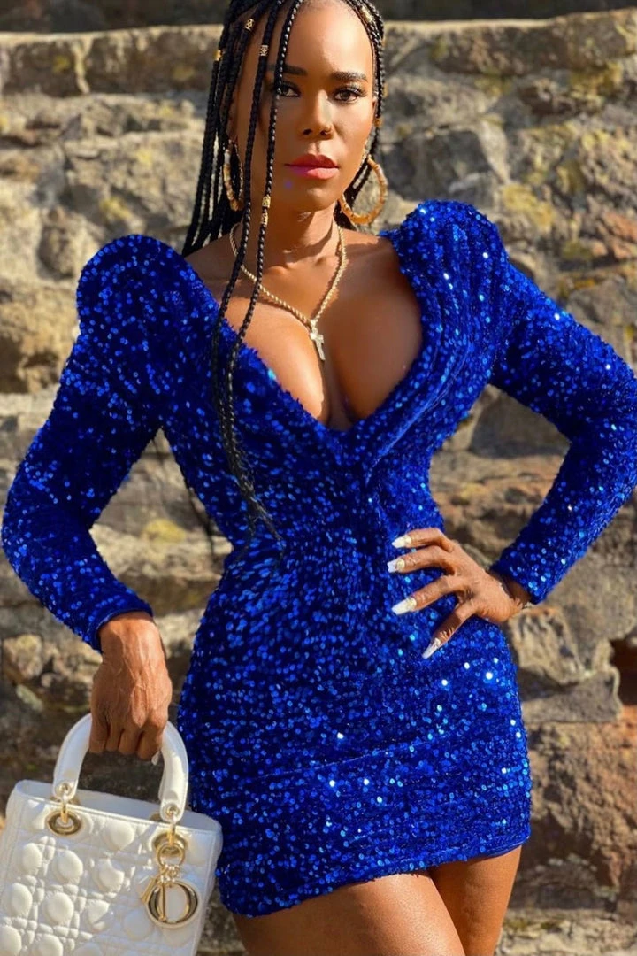 Go all out this season in this sparkly mini we’re loving! Featuring a long sleeve mini dress with a plunging v neck with mesh covering, sequins throughout, and a structured padded design for that high fashion look. Slick your hair back and add black pumps and a clutch for a complete look at your next formal event.