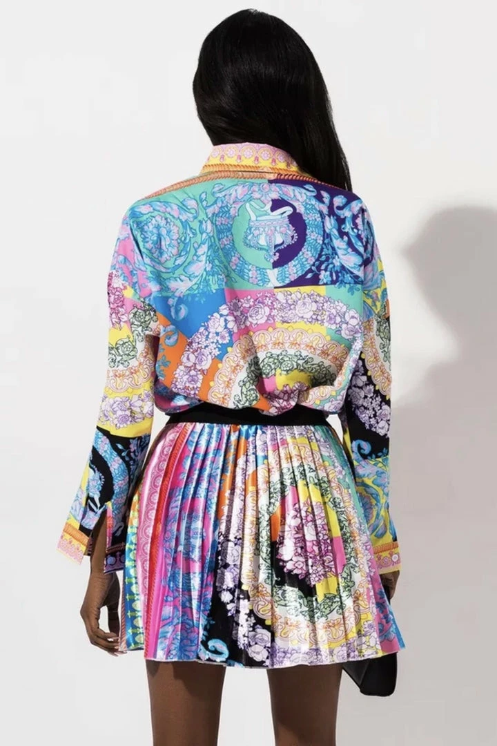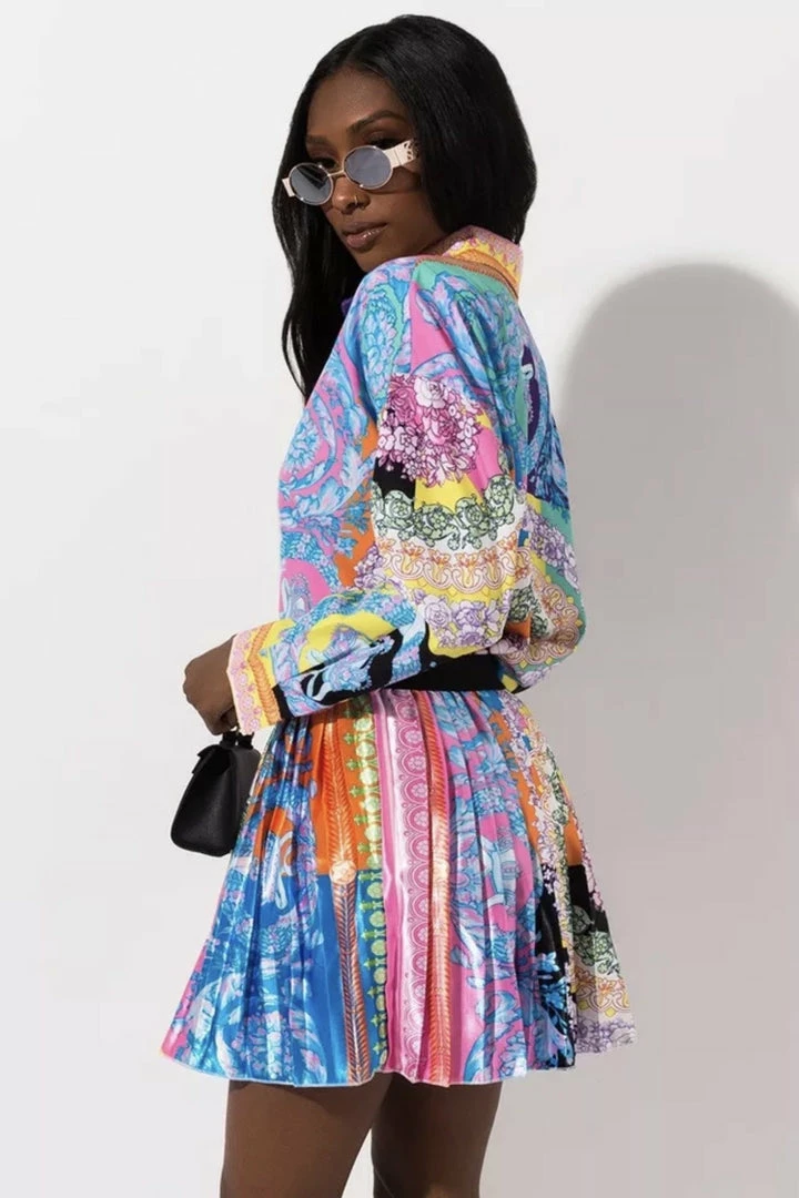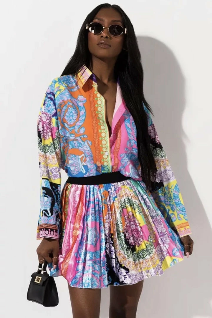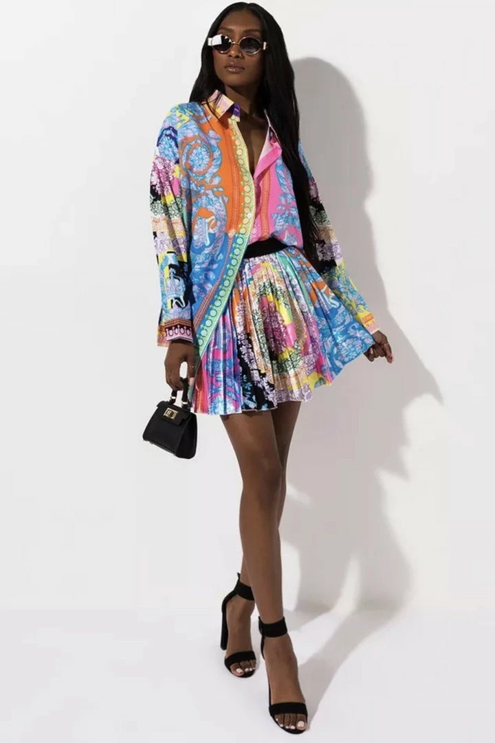 Look ultra luxe in this gorgeous set! Featuring a multi-color printed material on a long sleeve blouse and matching pleated skirt. Pair with a mini handbag and stilettos for your next brunch date.