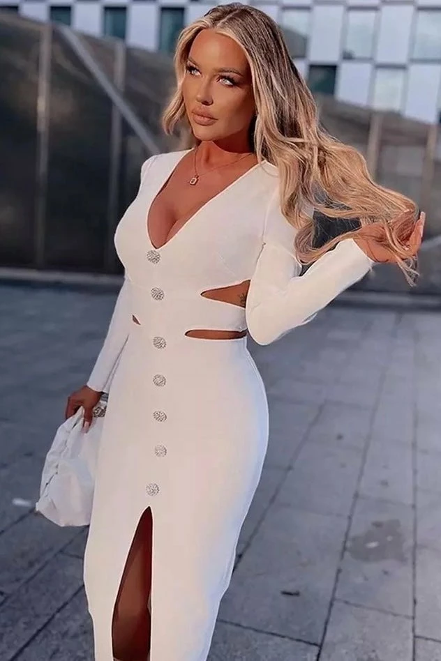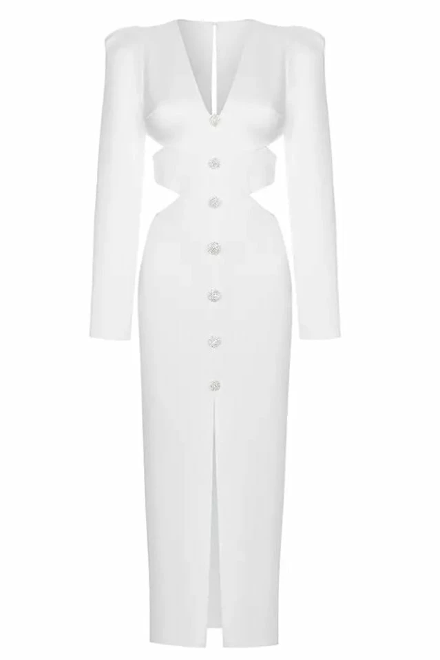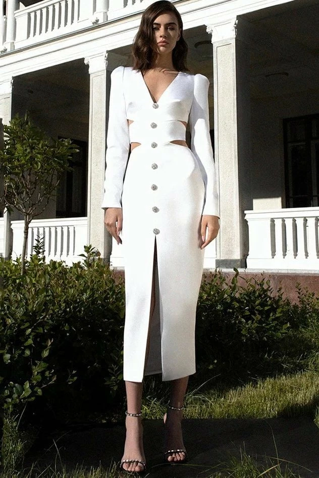 Go classic in this stunning white midi! Featuring long sleeves, side and back cut outs, silver button detailing, a split hem for comfort, and a bodycon bandage material. Style with simple heels and a diamond choker for an elegant night out.