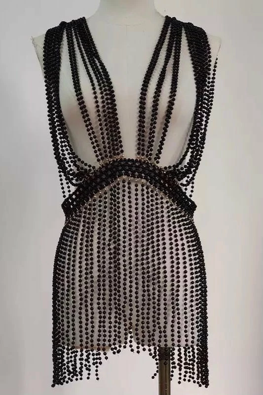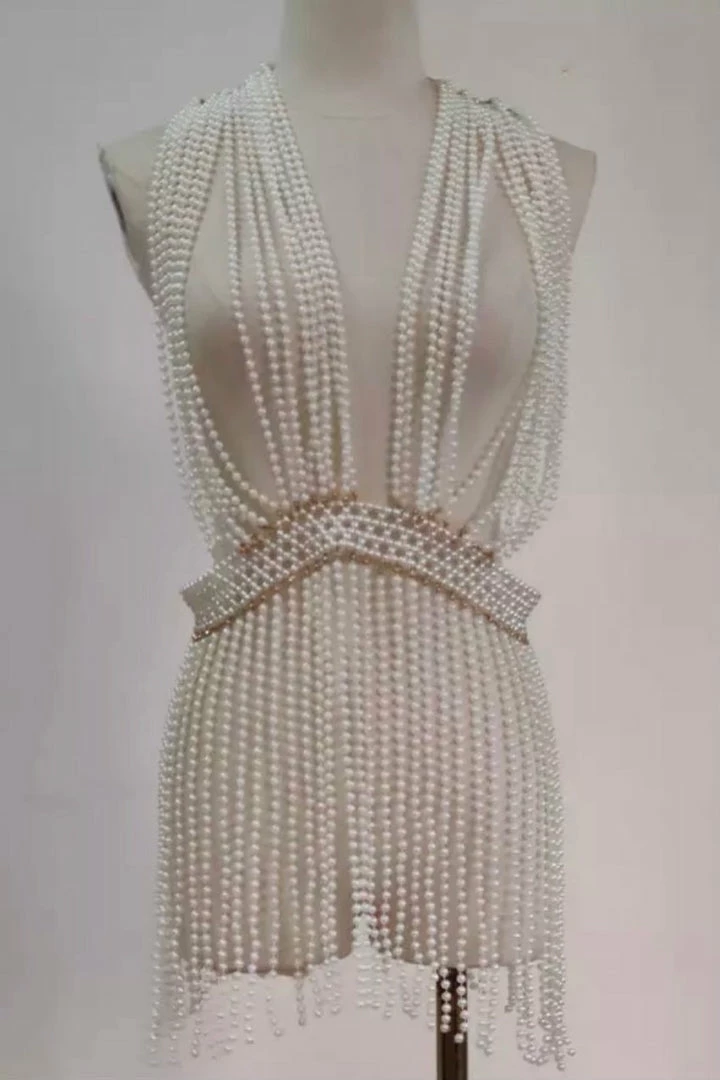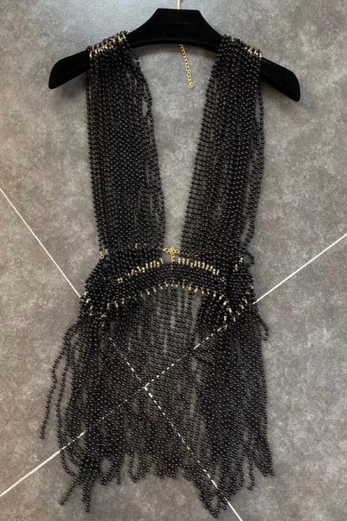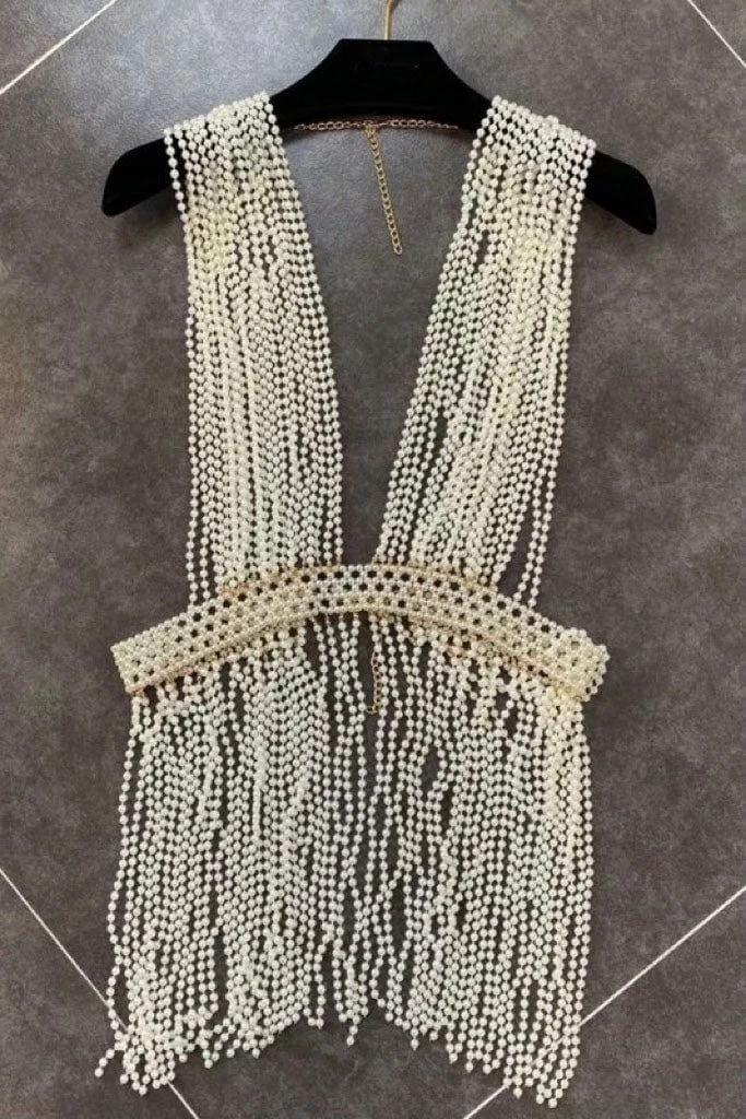 This pearl accessory top was made for a fashionista! Featuring a pearl vest top with a tassel fringe design and gold chain enclosures. Get creative by styling over a bra top with high waisted shorts or team this under a blazer for a high fashion look.