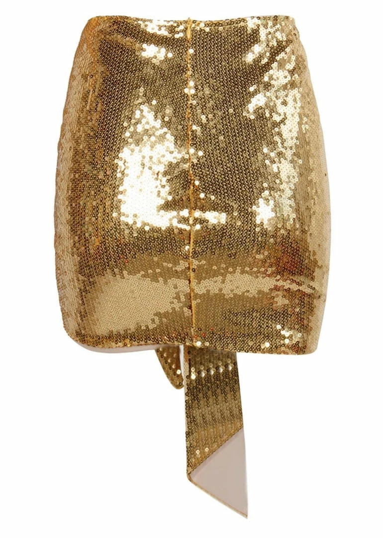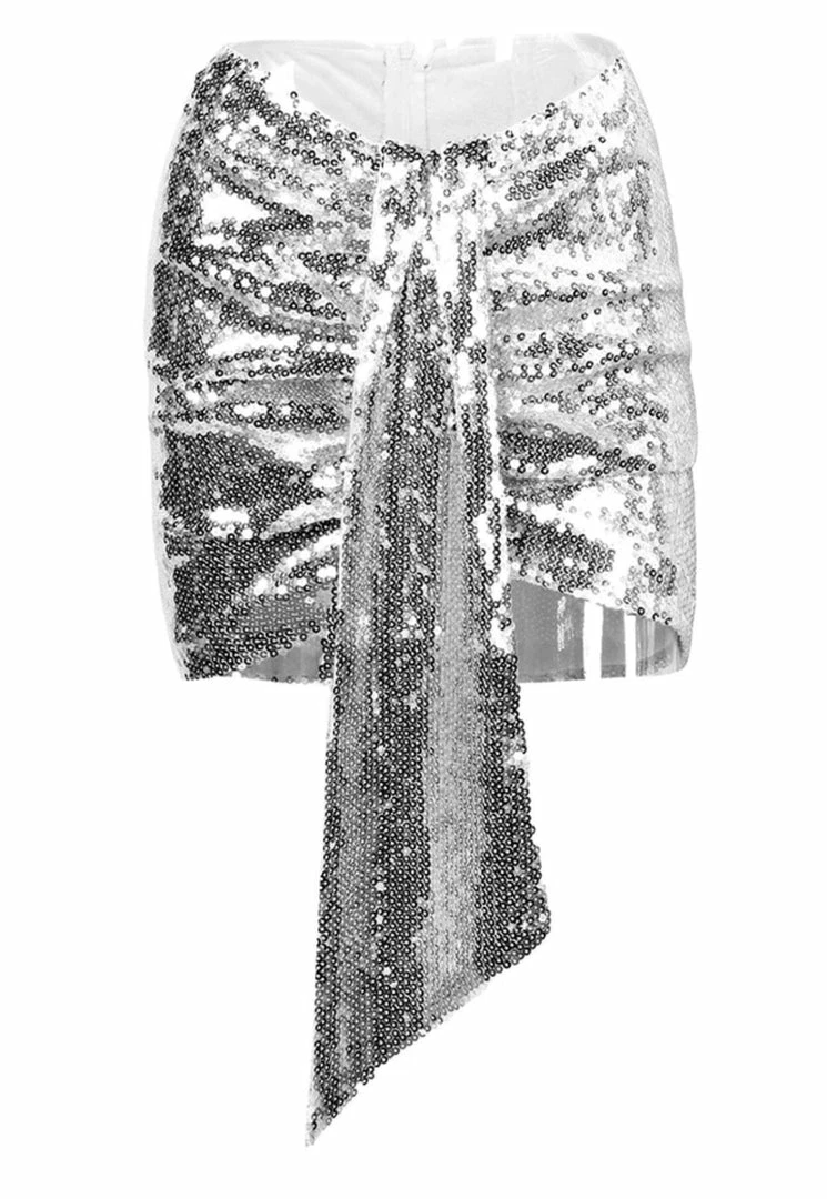 Be the center of attention this party season with this gorgeous skirt. Featuring a sequin material, high waisted fit, draped detailing, and mini length. Pair with a bodysuit an heels for a special occasion.