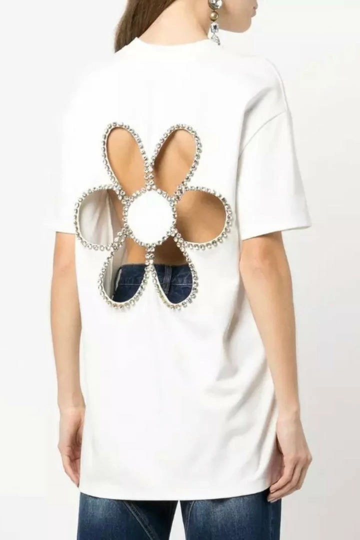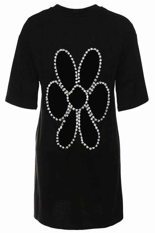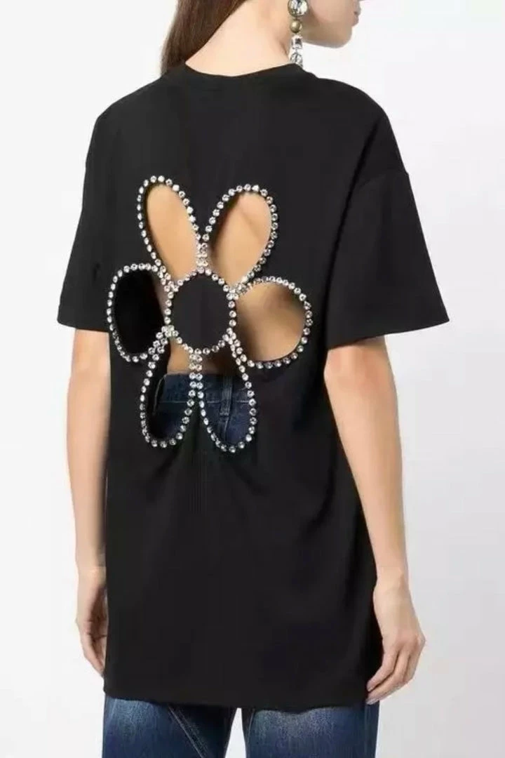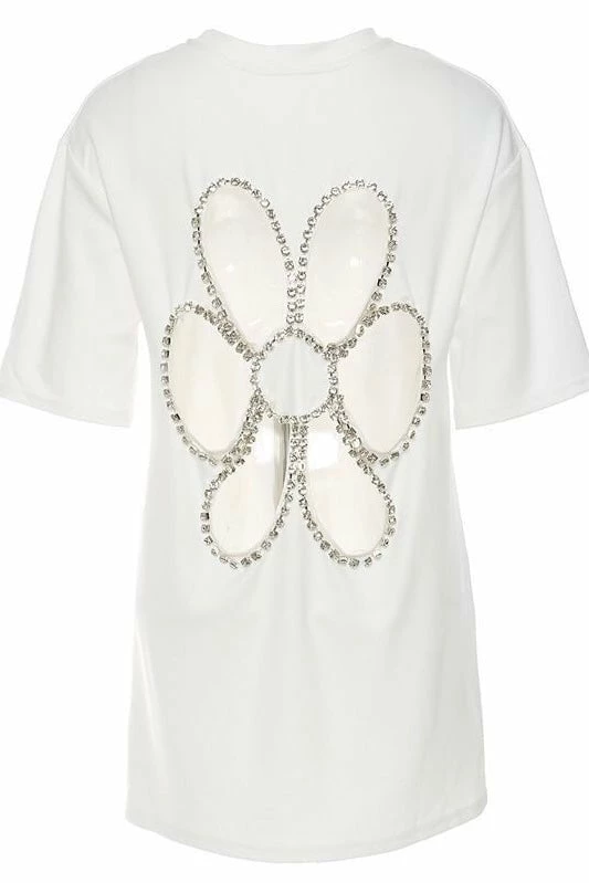 Summer is in full bloom! This top features a backless, rhinestone flower design, short sleeves, and an oversized fit. Pair with jeans and a pony tail to show off your casually cute look!