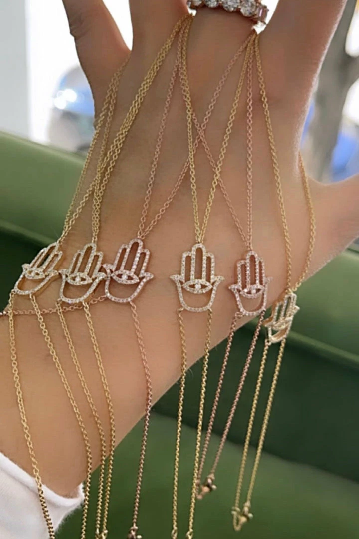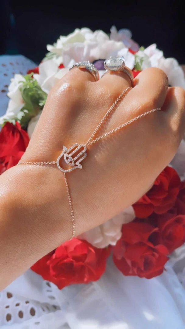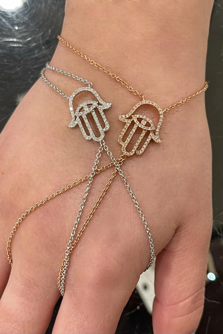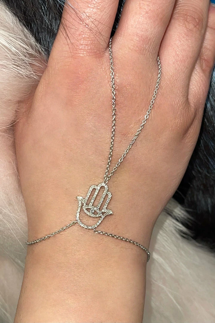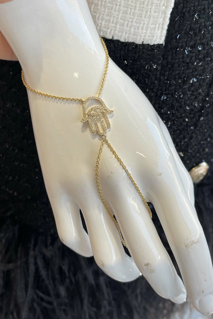Add the evil eve to any look this season for the perfect finish. Featuring a hamsa evil eye that connects as a bracelet and as a ring with a 3.8 gram gold bracelet and a 0.33 carat dia.