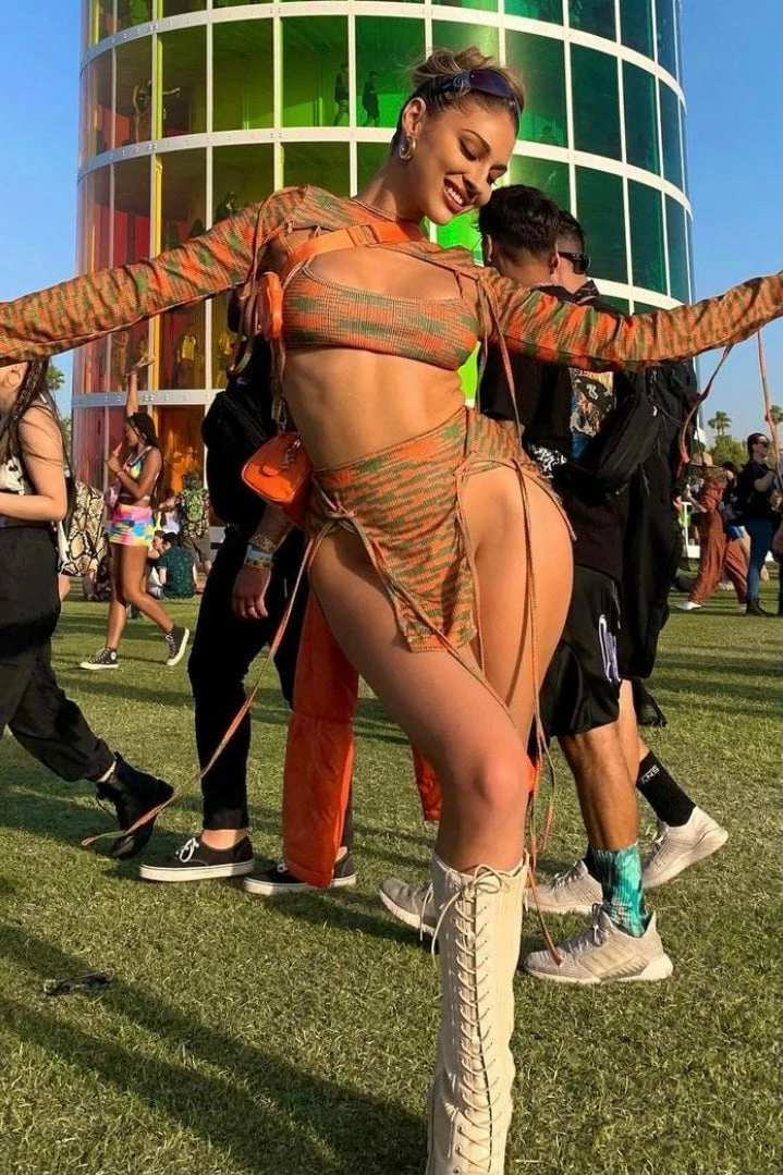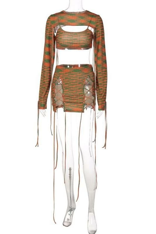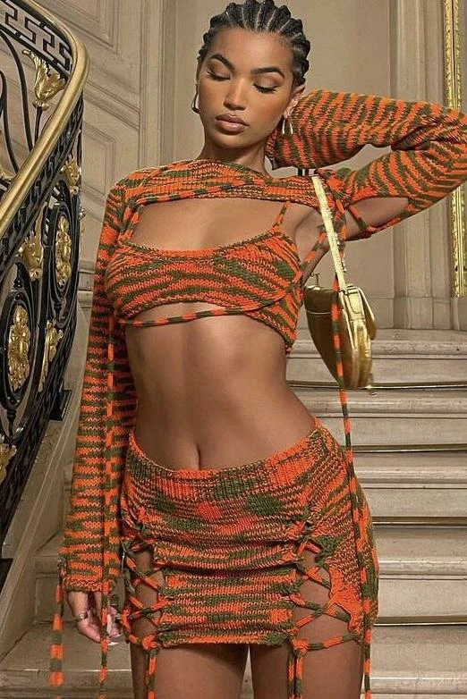 Cozy knit styles you can take to the club! Featuring an orange and green printed, thin strap bralette, a long sleeve extreme crop knit top with long knit springs, and a matching high waisted skirt with dual lace up thigh designs. Pair with booties and a shoulder bag for the hottest look in the room!