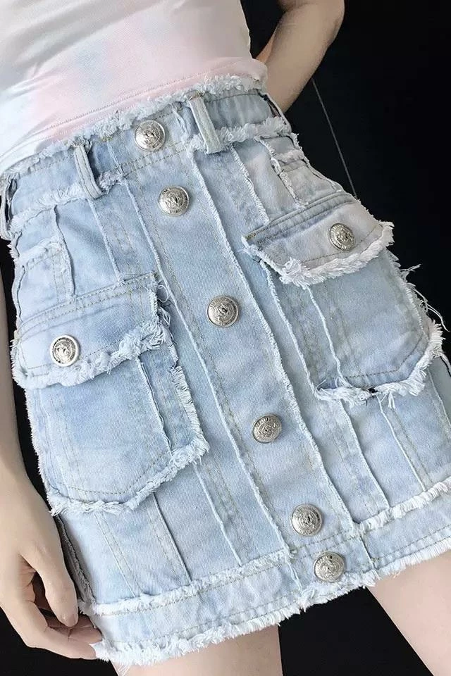 This gorgeous denim skirt features distressed details, high waisted fit, gold button embellishments, pockets, mini length, and zipper closure.