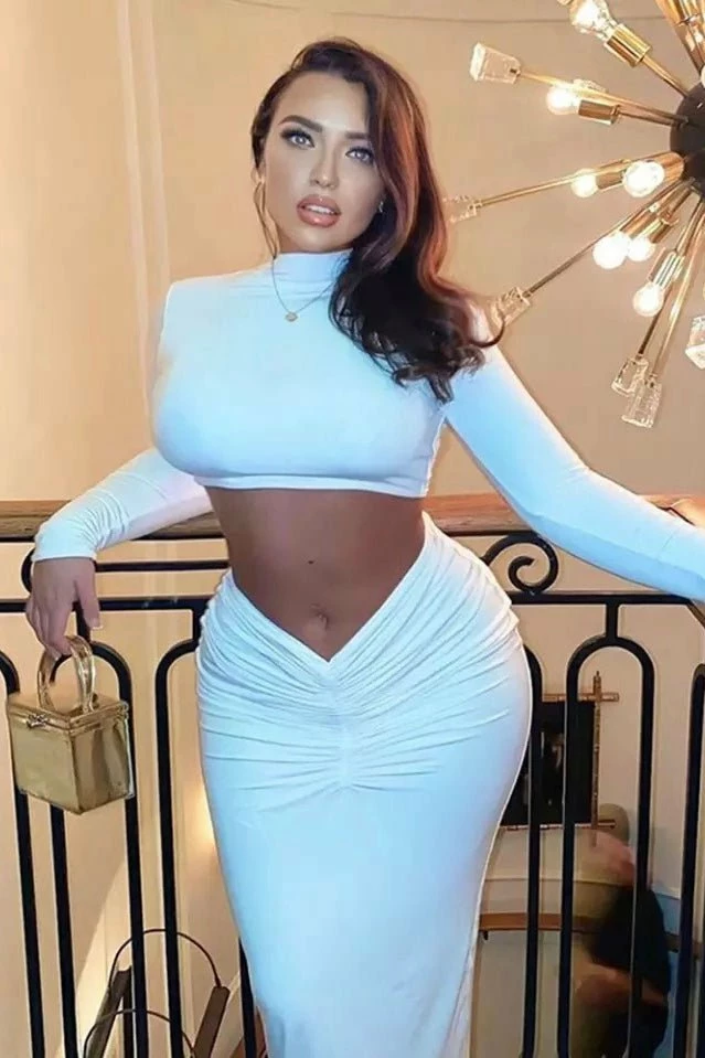 Show off in this hot two piece set. Featuring a long sleeve crop top and matching high waisted ruched maxi skirt. Pair with gold accessories and strappy heels to complete the look.