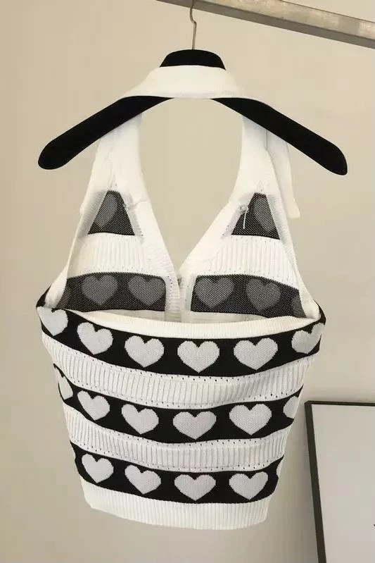 We’re crushing on this knitted, heart pattern, color block, collared, backless, halter crop top. Pair with distressed high waisted shorts or baggy jeans to become a complete cutie.