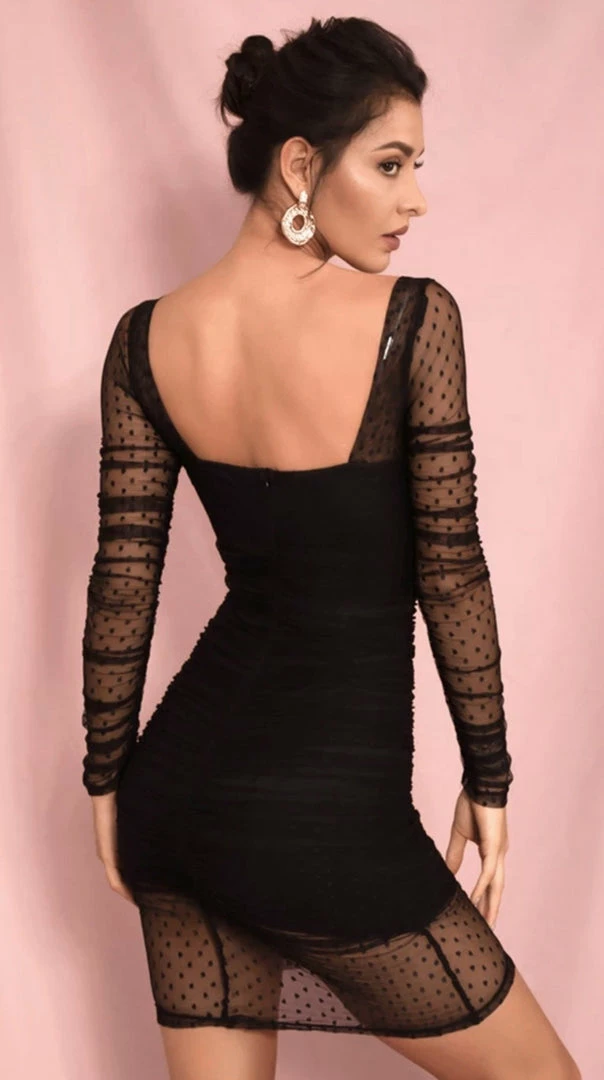Nail major trends this season with this bodycon dress! Featuring a black dobby mesh fabric with a bardot neckline and long sleeves. Style with black boots and a mini bag for a night out with the dolls.
