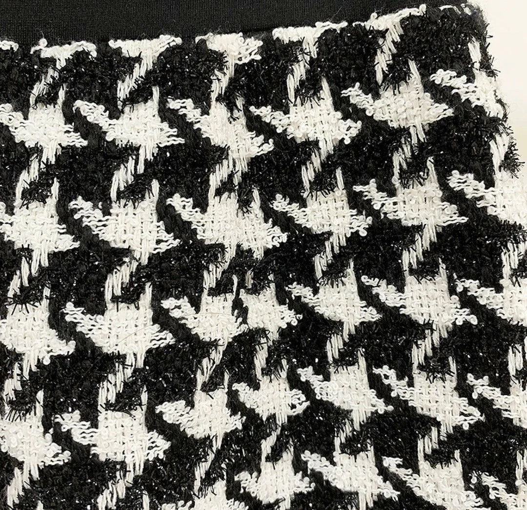 This print is a must-have this season! Featuring a houndstooth print, gold button embellishments, mini length, and tweed material. Pair with our matching cropped ‘Harriet’ jacket!