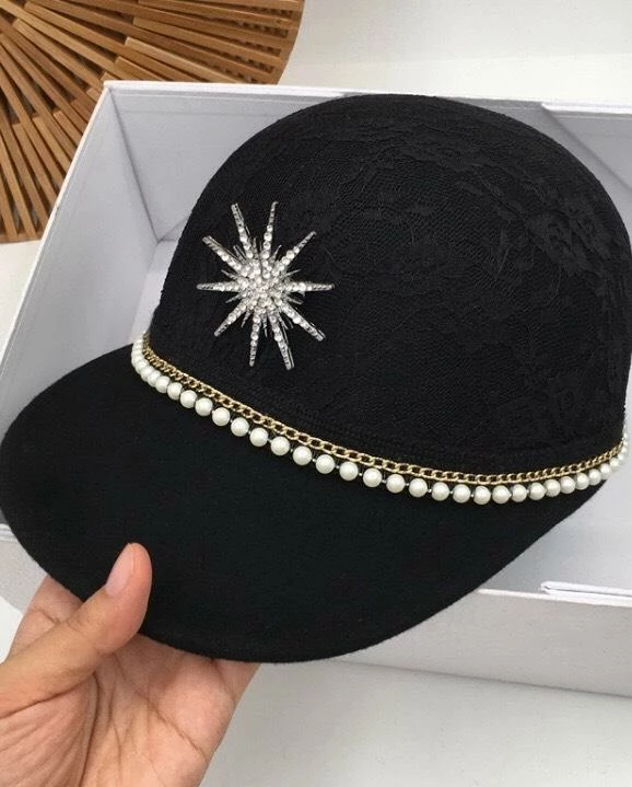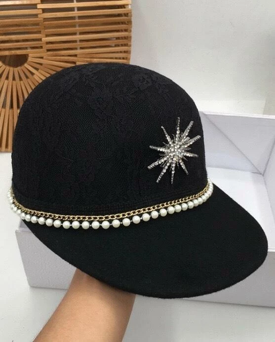 This edgy hat includes a baseball style, wool material, pearl and diamond embellishments, and lace overlay.