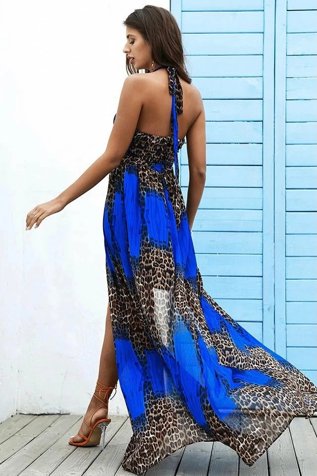 Feel the summer breeze in this perfect maxi! Featuring a halter neck style dress with strappy cut outs, a leopard patchwork style, and a leg slit. Style with a floppy had and strappy sandals to hit the tiki bar!