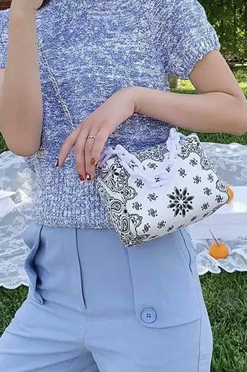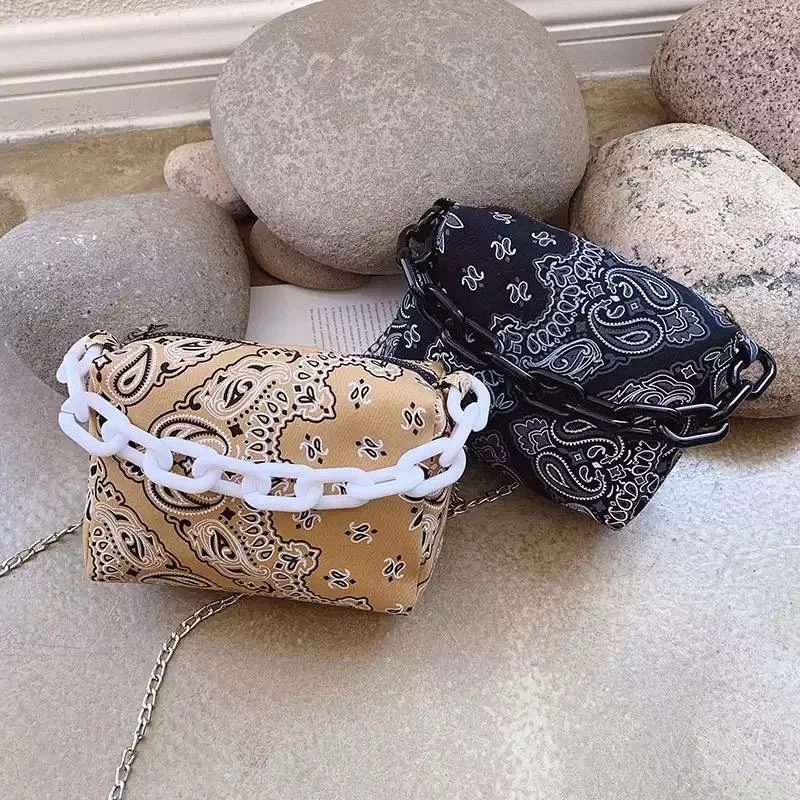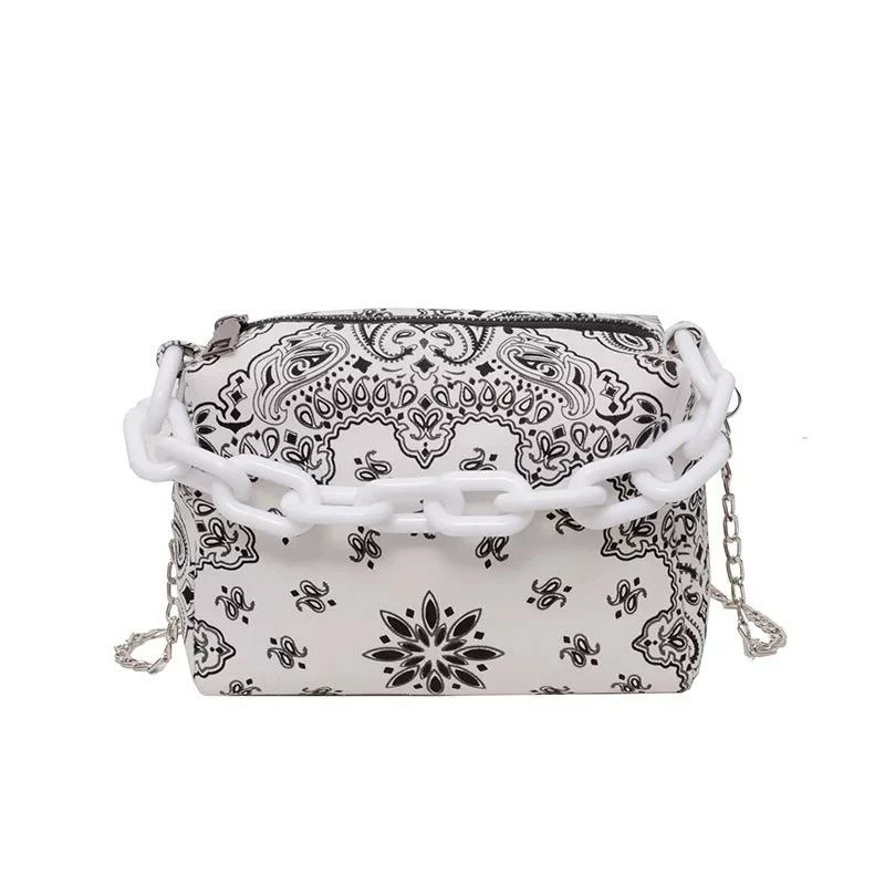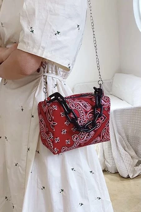 This mini purse features a bandana print, a chain link short strap, and a gold chain long strap. Get this cute funky bag for your next night out!