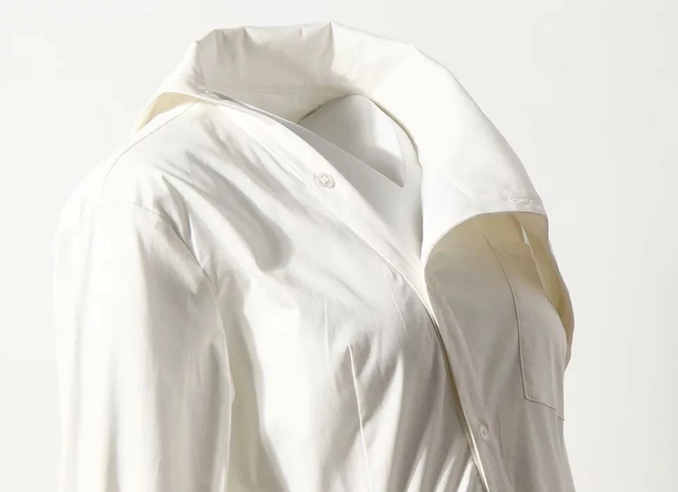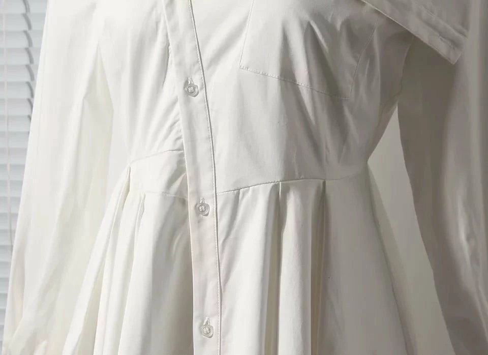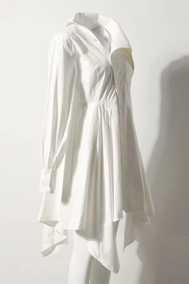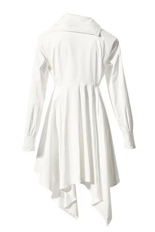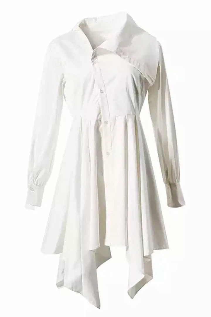 This dress puts a stylish spin on the classic t shirt dress look. It features long sleeves with wrist cuffs, an asymmetrical lapel and hem, off centered button down, and a just below the knee length. Pair this with strappy heels or sandals in the summer time for a casually cute and easy outfit!