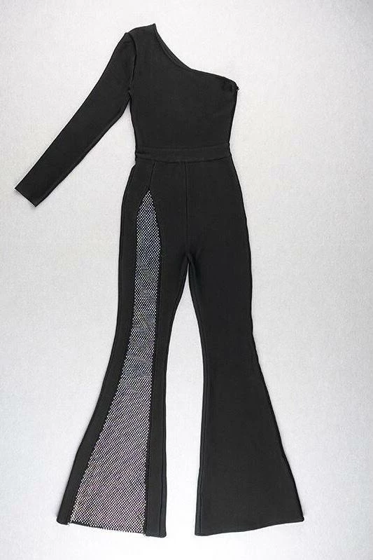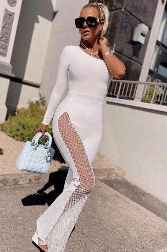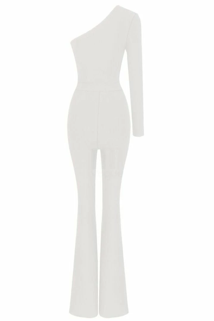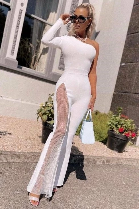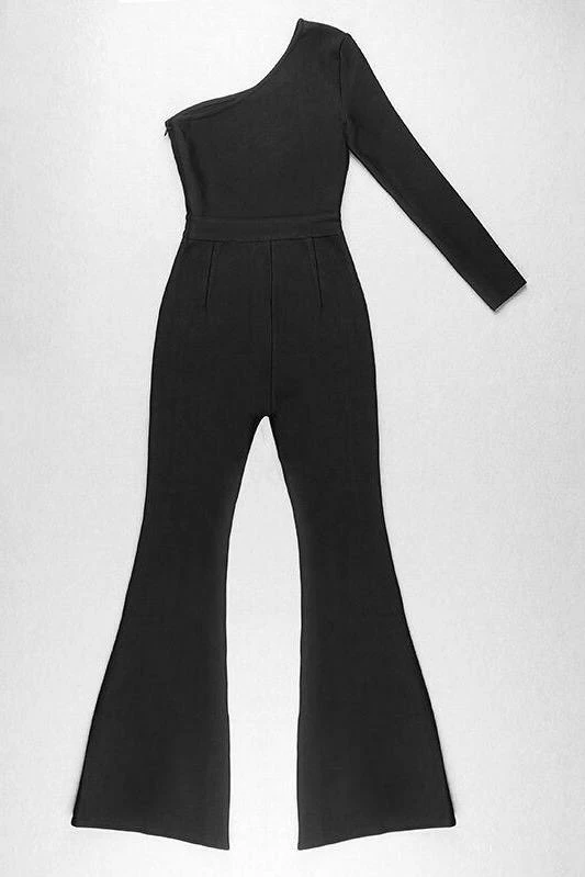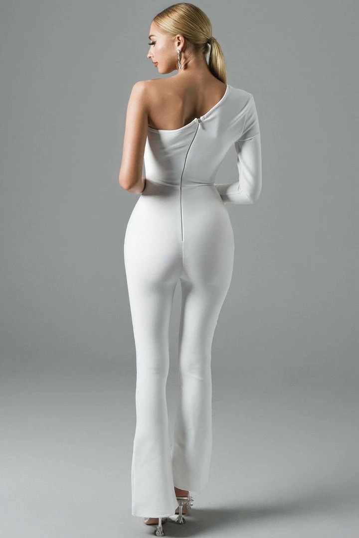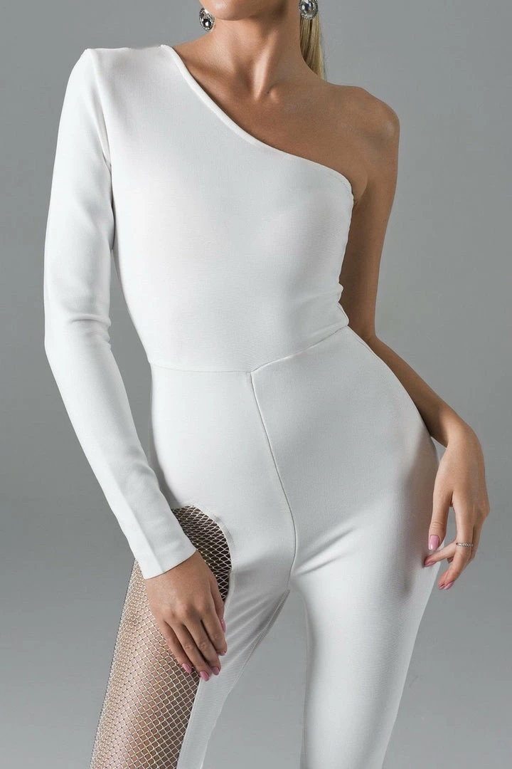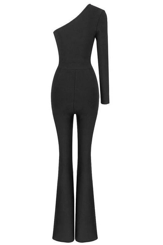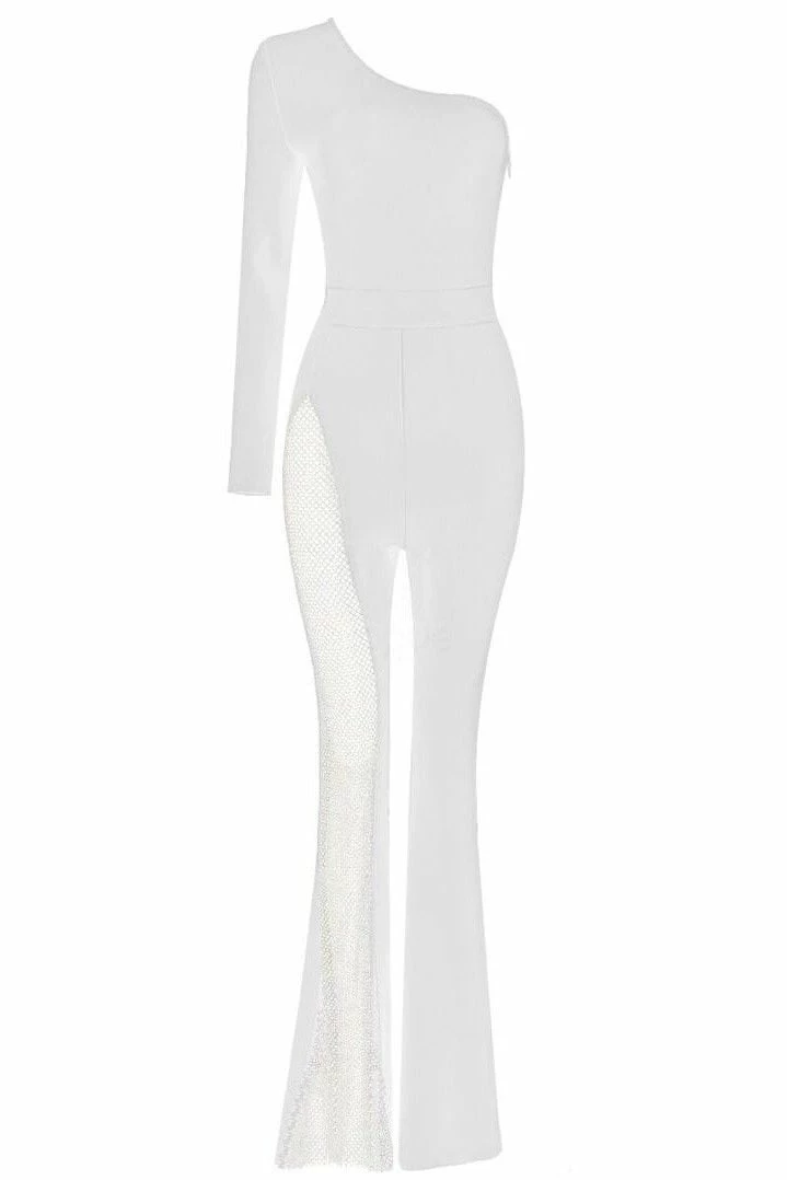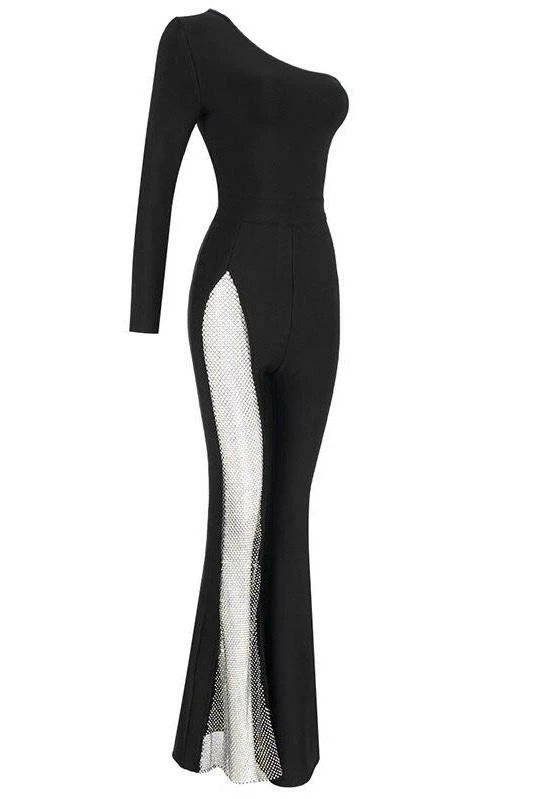 Turn every head with this killer jumpsuit! Featuring a long sleeve one shoulder and a fully crystal pant leg. Add delicate accessories and killer heels to finish off the look.
