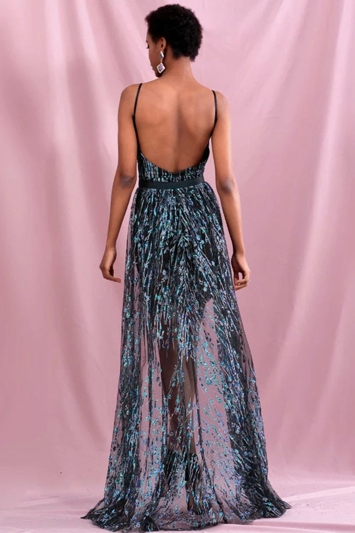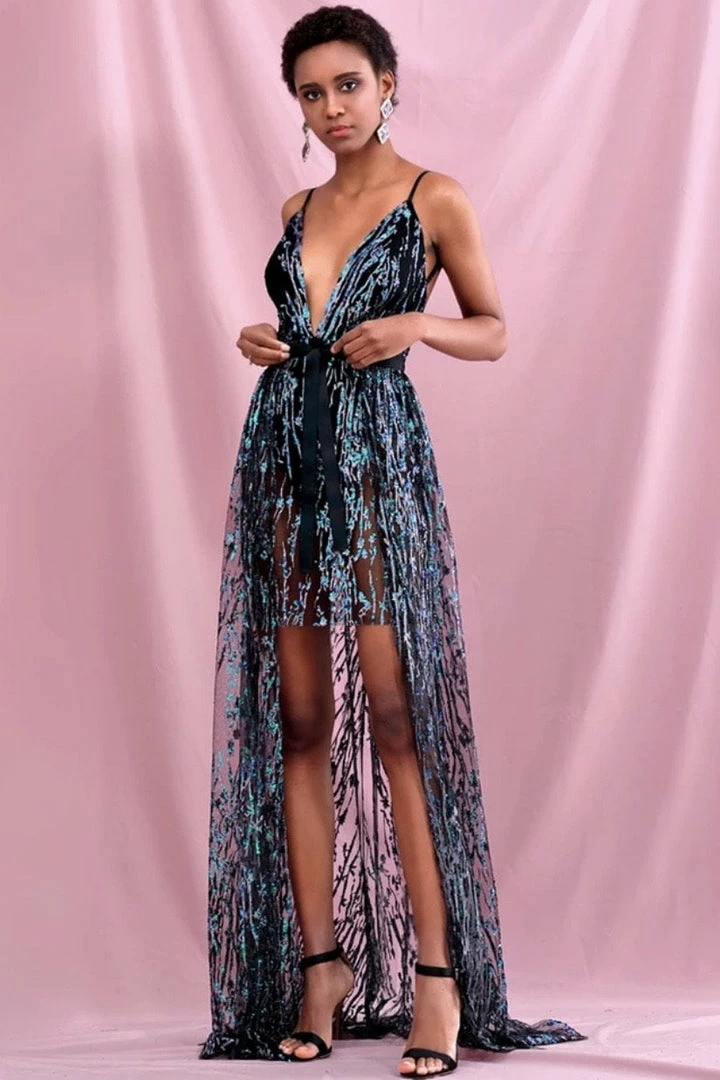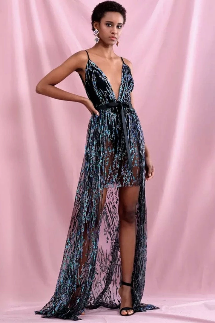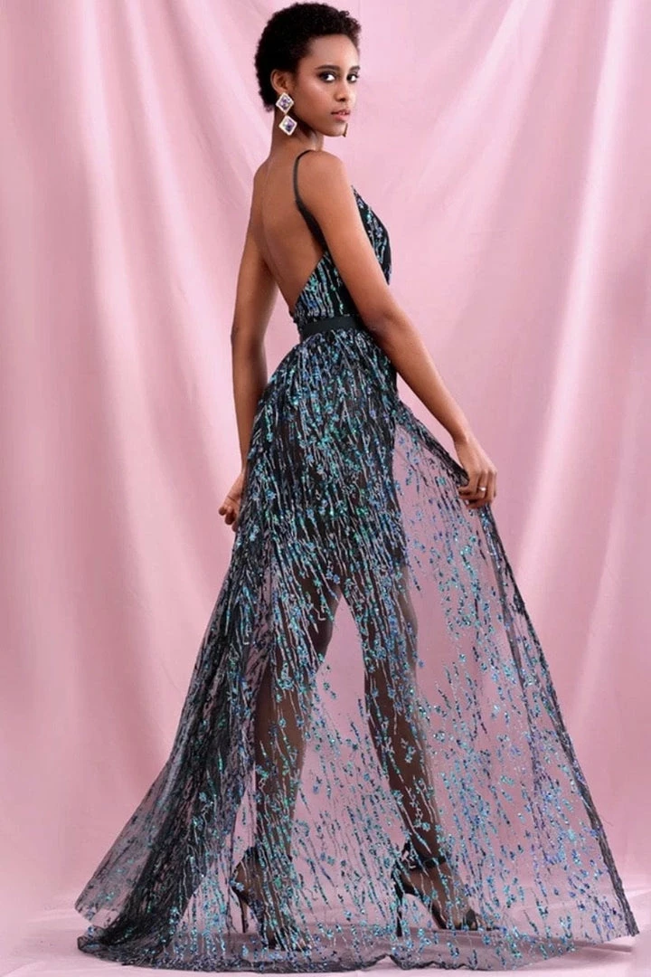 We are loving the details of this stunning piece dolls! Featuring a beaded material, deep v neck, sheer details, and removable overskirt.