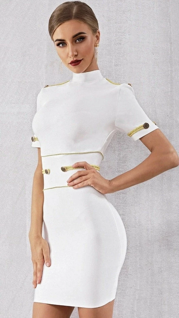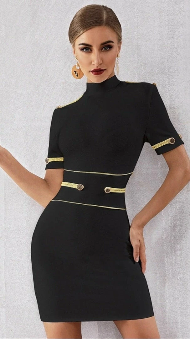 Boss Lady. Our ‘Ivanna’ dress features a mini length, high neck, short sleeves, grommet details. Pair with heels and a high pony.
