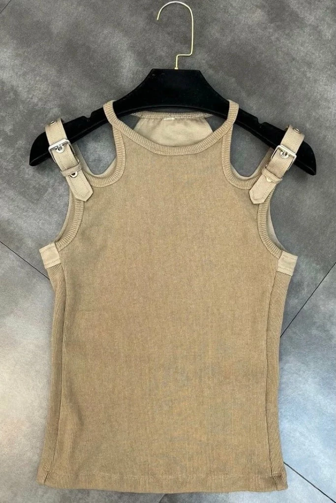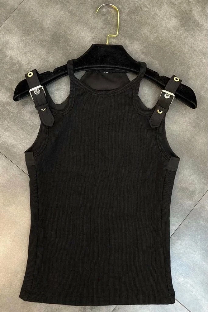 Upgrade your basics for the new season dolls! This tank top features dual straps with a silver buckle detailing. Pair with denim shorts and sneakers for the ultimate casual summer look.
