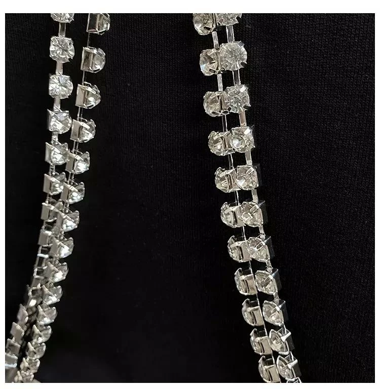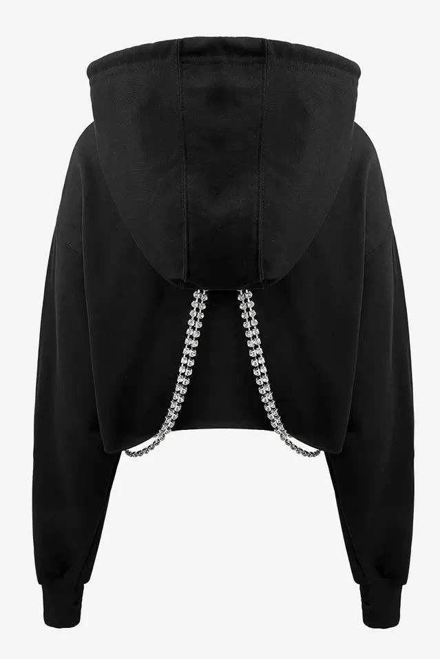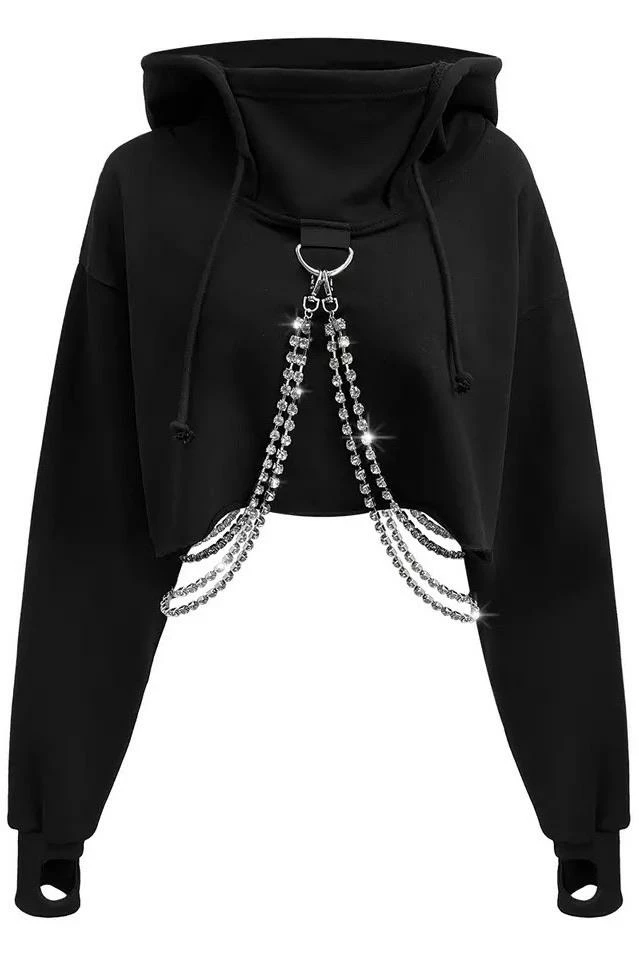 Bring cool back to casual in this high collar hoodie with symmetrical rhinestone chains draping down the sides, a jaw string detail, and thumb holes. Pair this with shorts or sweat pants for a casual date night in or to run over to your friend’s house in style.