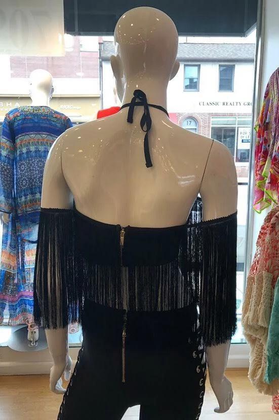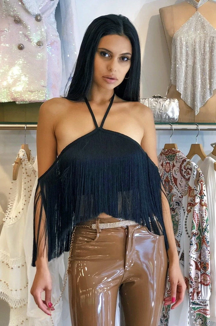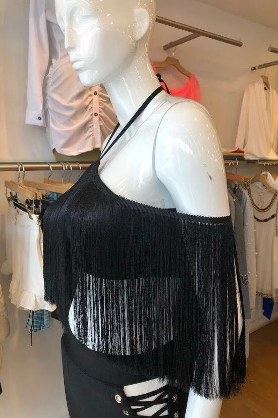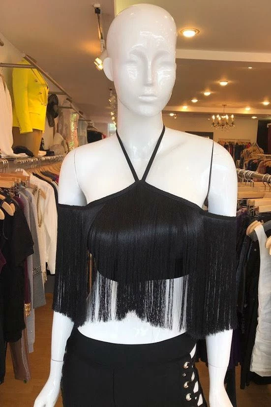 A funky yet functional piece to add to your wardrobe. This crop top features an open shoulder, open back, fringe detail, halter neck, and 3/4 length sleeves. This top can be paired with almost anything depending on your mood – a mini skirt, denim jeans, latex pants, and more.