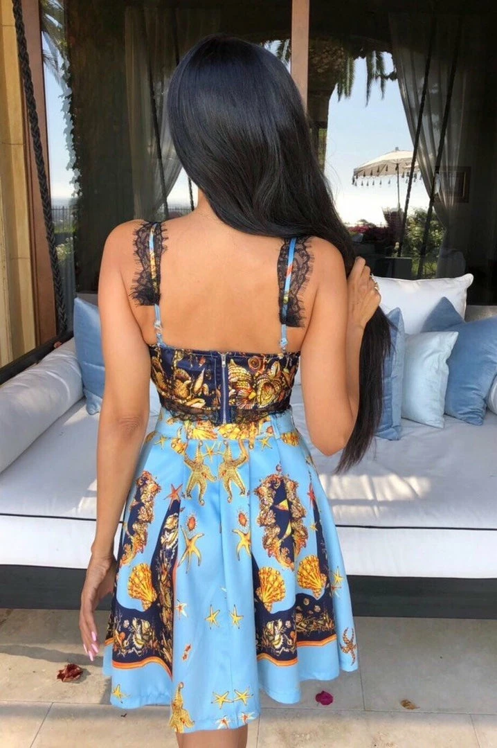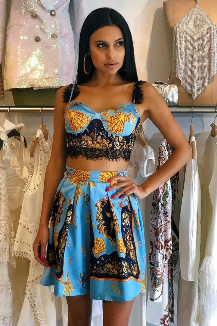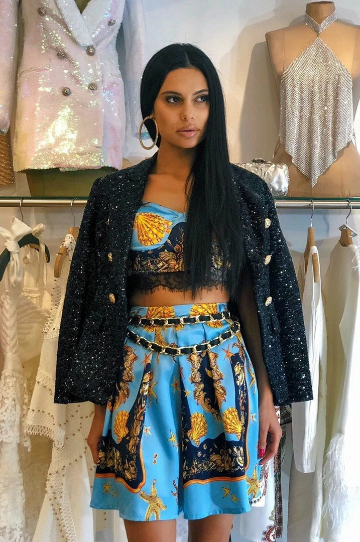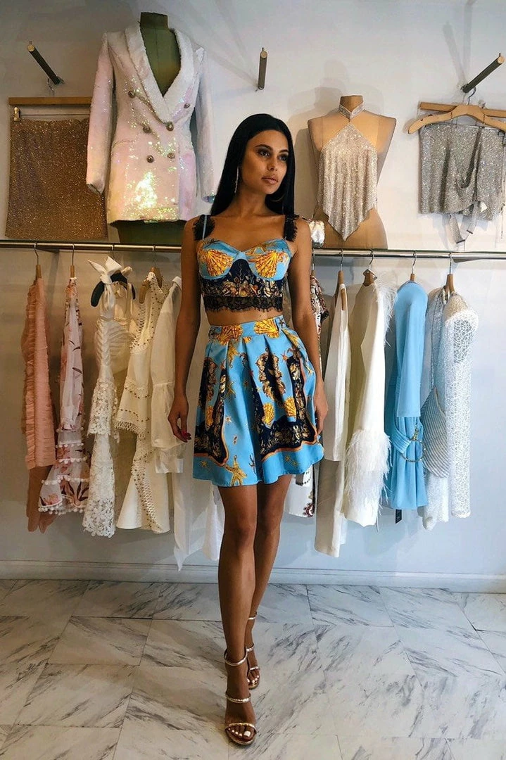 This outfit is giving us all the luxe vibes. This two-piece set includes a beautiful blue chain print material on a crop top tank top and matching pleated skirt that hits right above the knee. Pair with black heels.