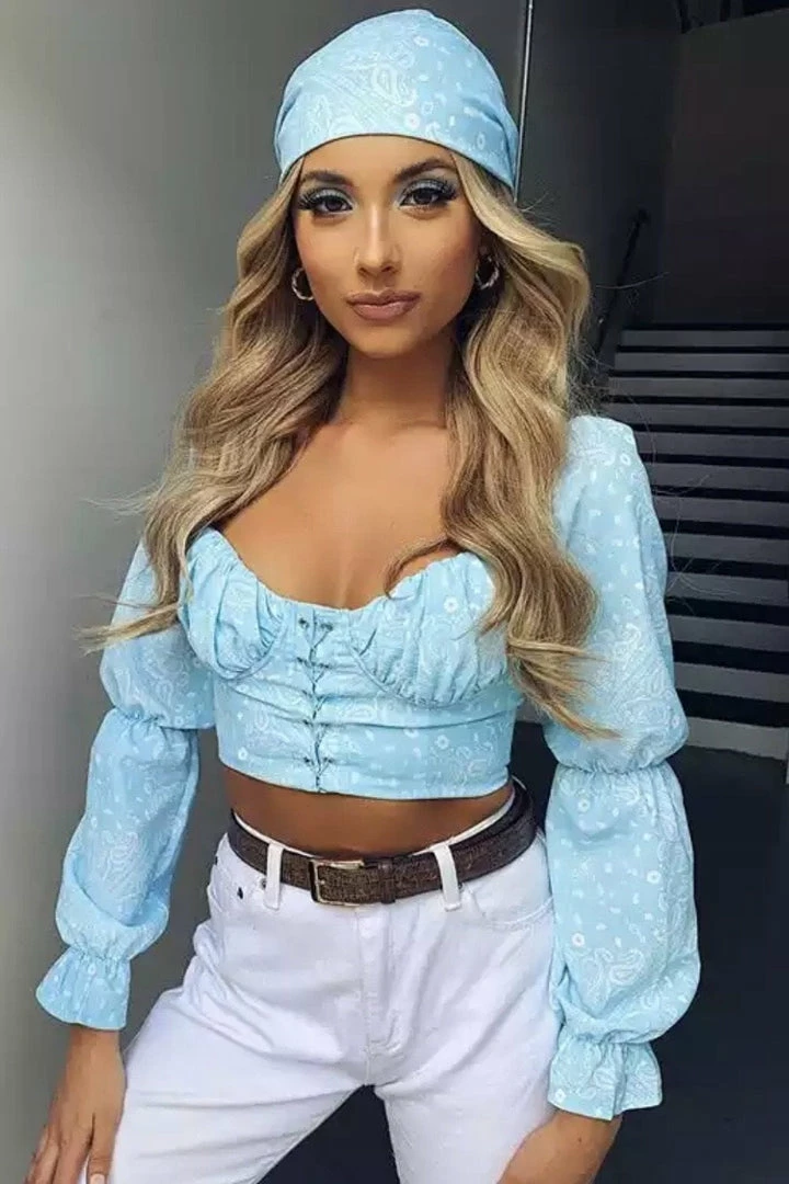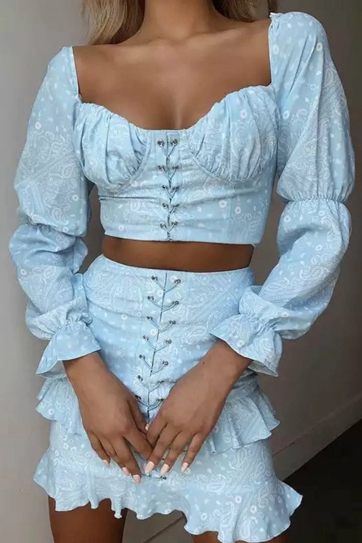 This three piece set includes a long sleeve crop top, matching high waisted skirt, and matching scarf! Pair with wedges and tousled waves for a daytime look.