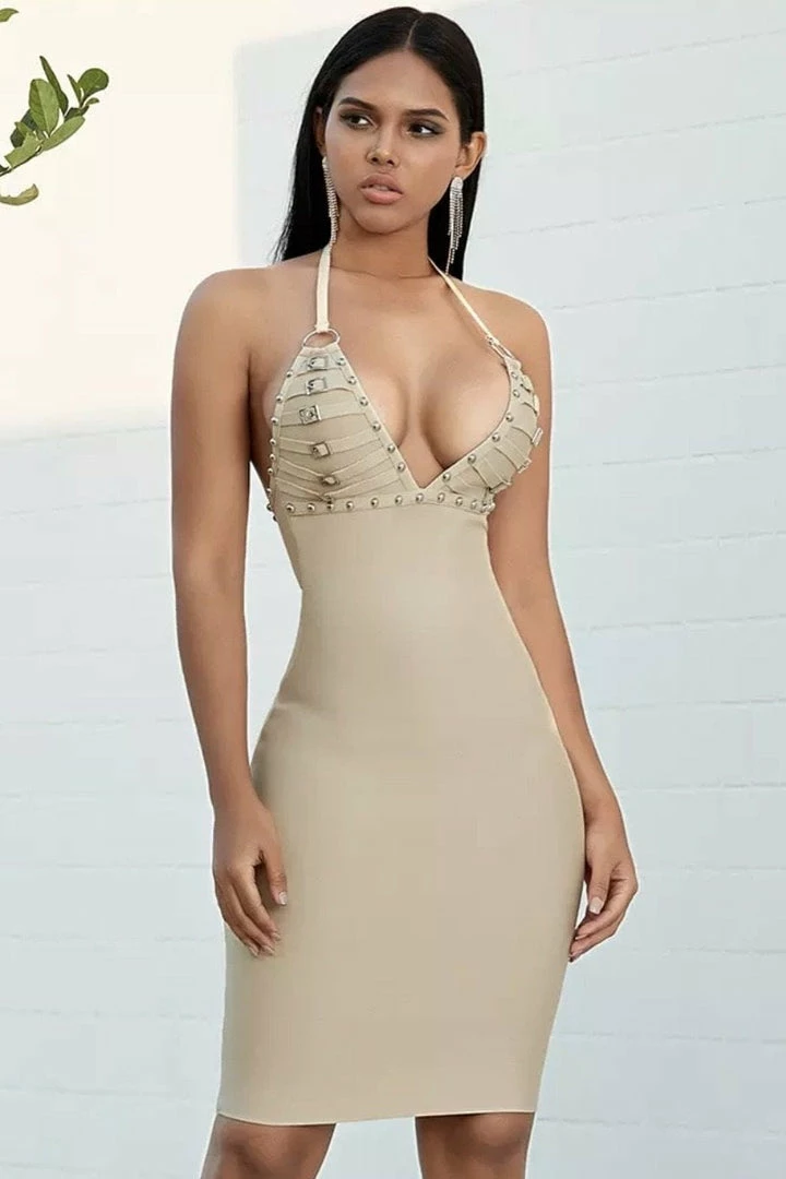 The dress of your dreams!! This piece features a v-neck and backless style, bandage material, bodycon fit, and a midi length. Pair with nude heels and a summer glow to catch everyone’s eyes.