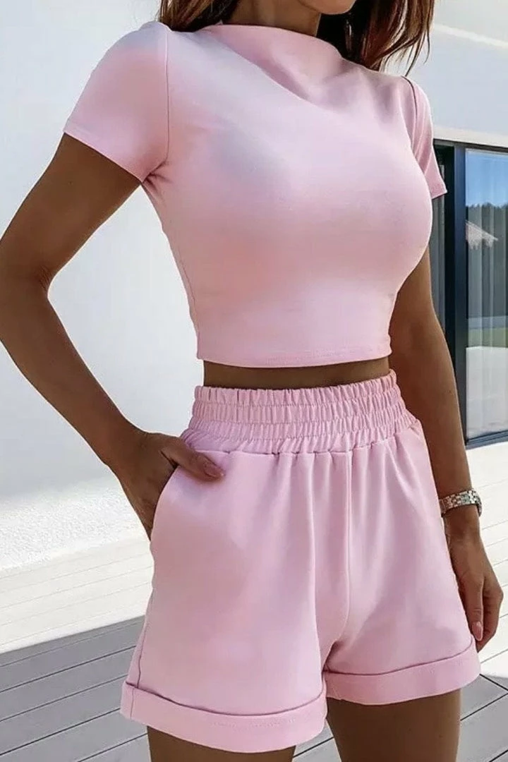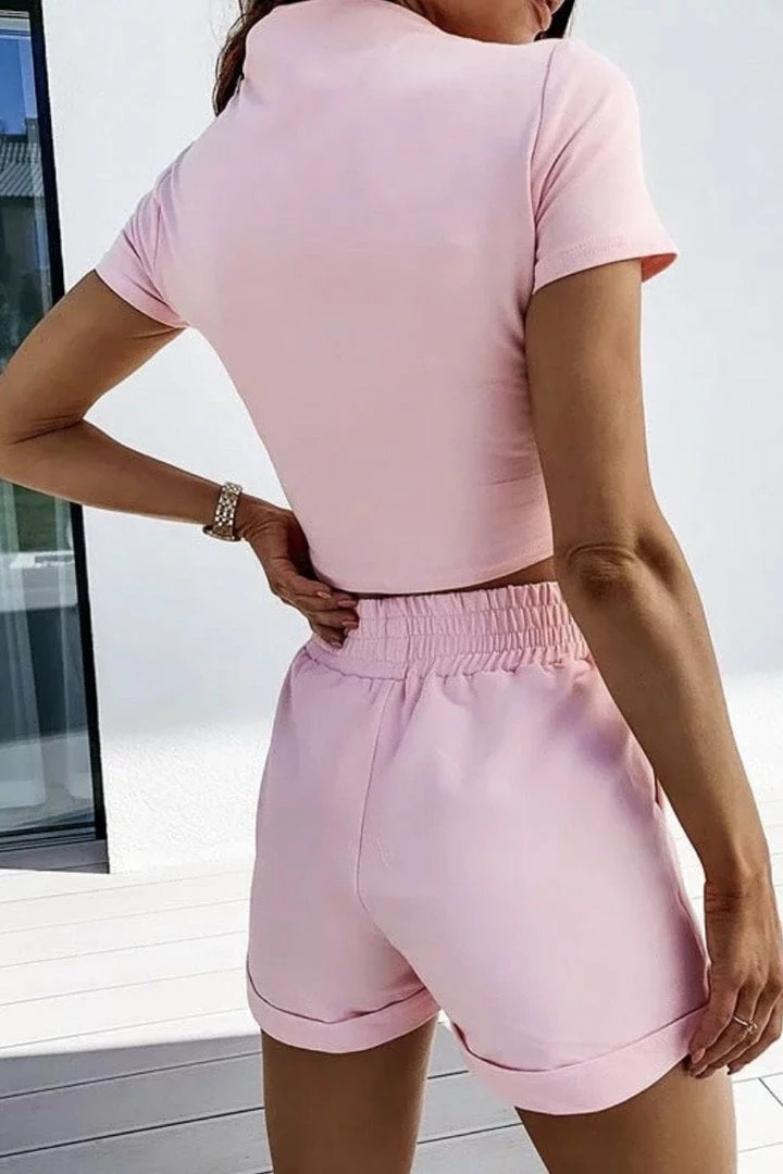 The most perfect set for your casual, laid back days! Featuring a cropped short sleeve top with matching high-waisted sweat shorts. Pair with white sneakers and a mini backpack!