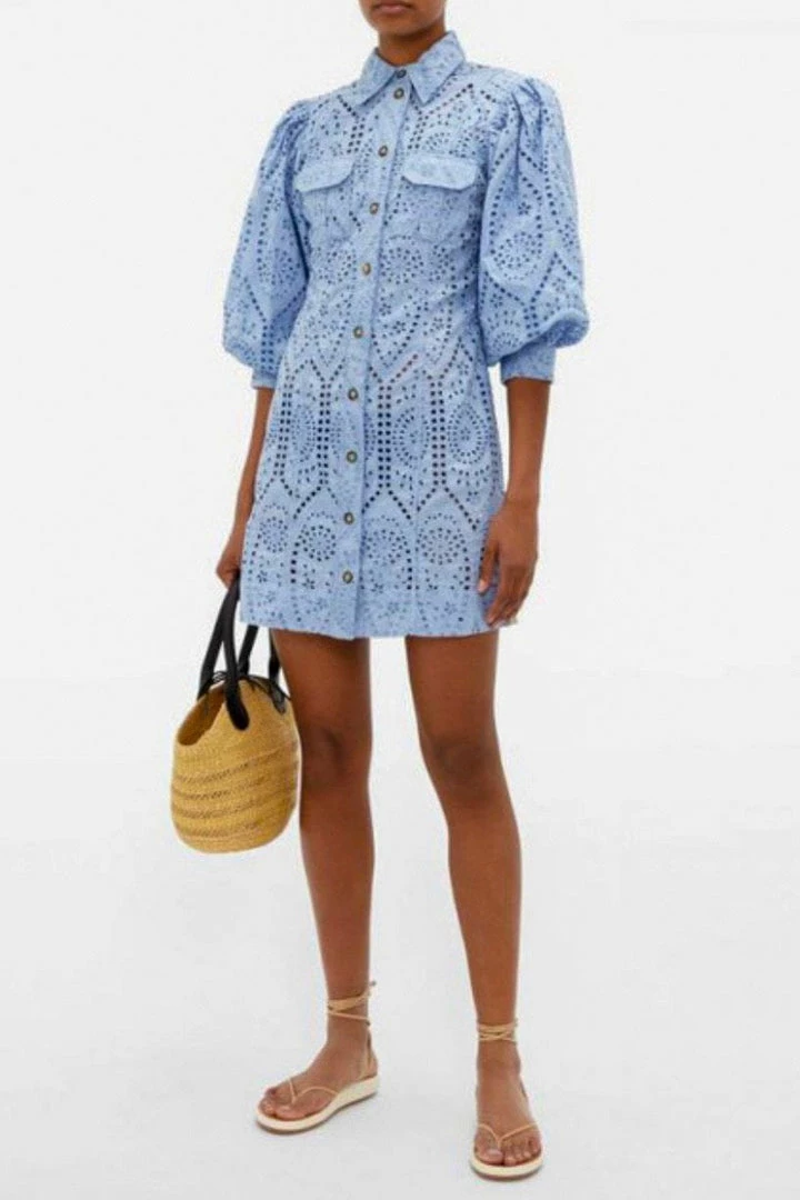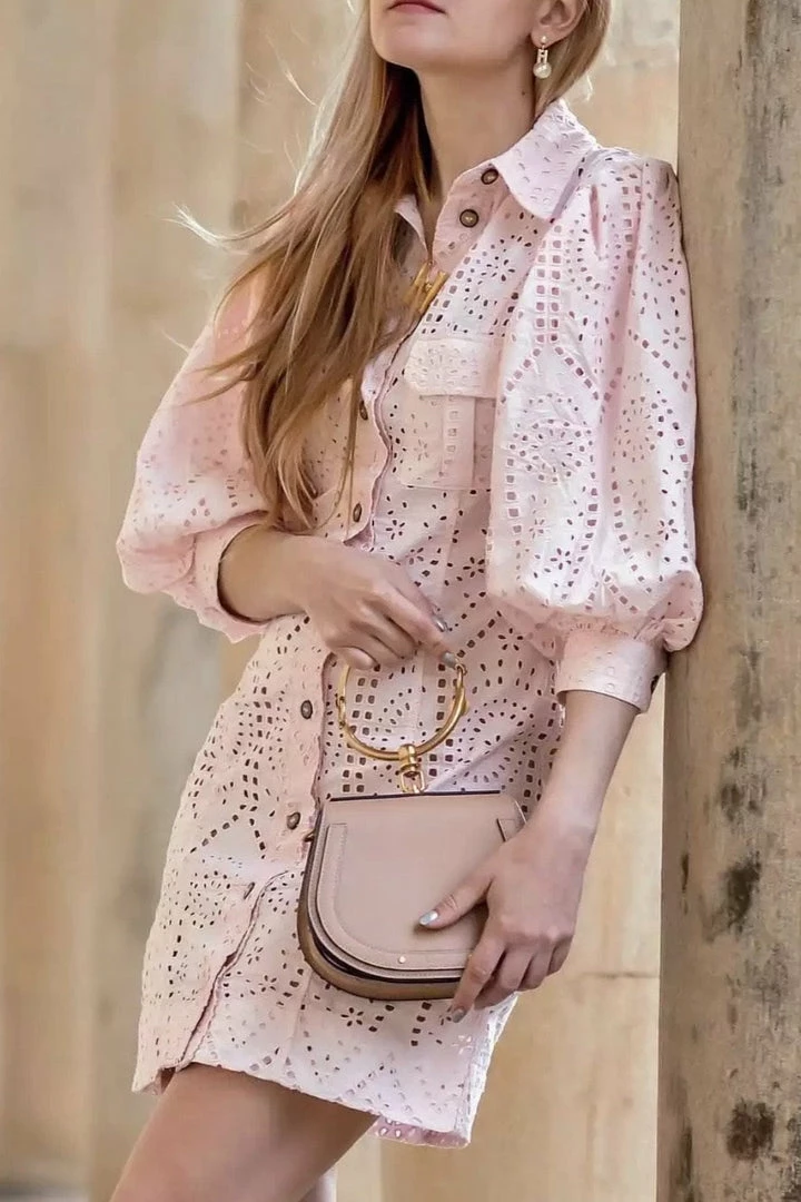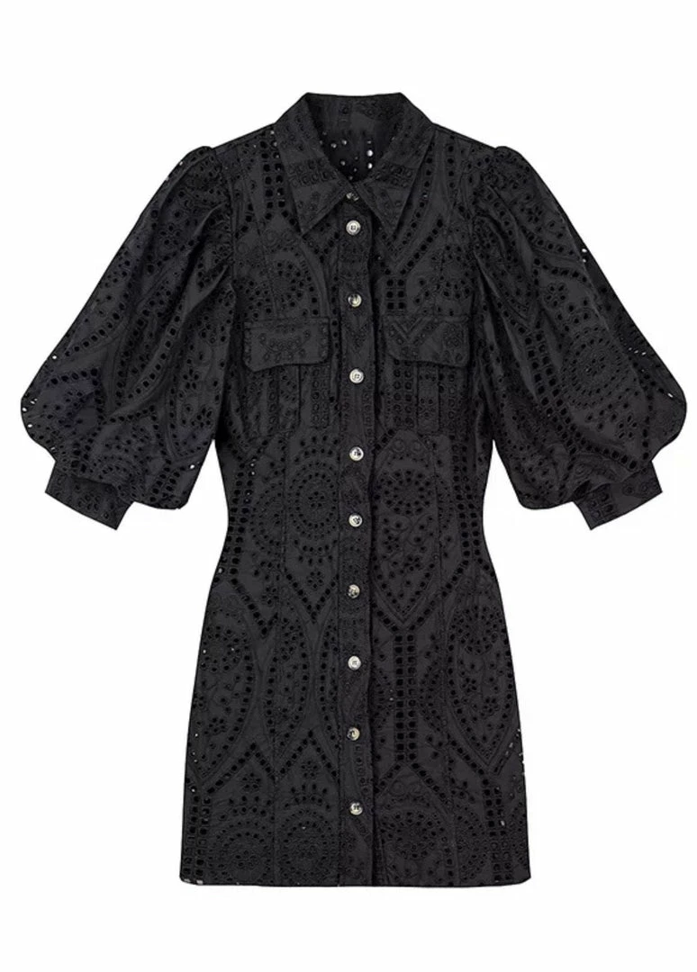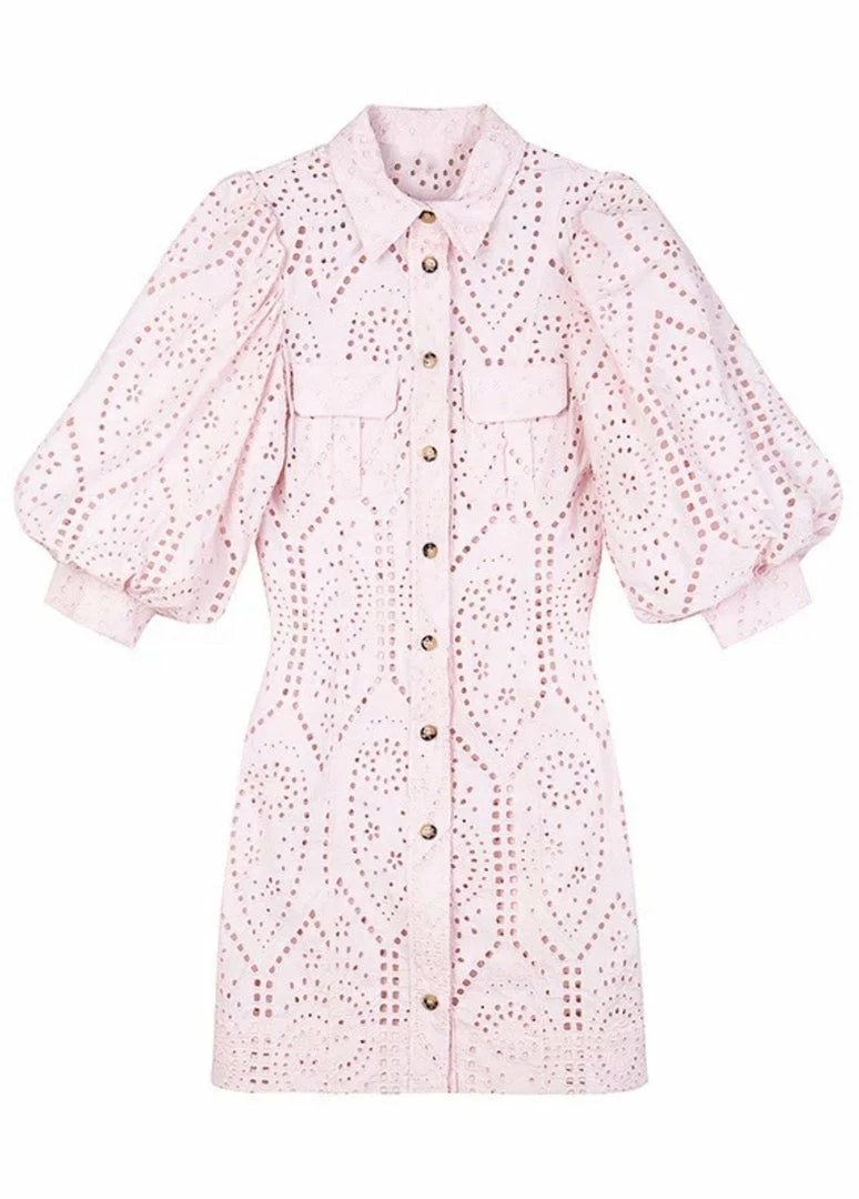 The perfect summertime dress! Featuring an eyelet material, short sleeves, collar detail, buttons down the front, and a mini length. Pair with wedges and a cute mini bag.