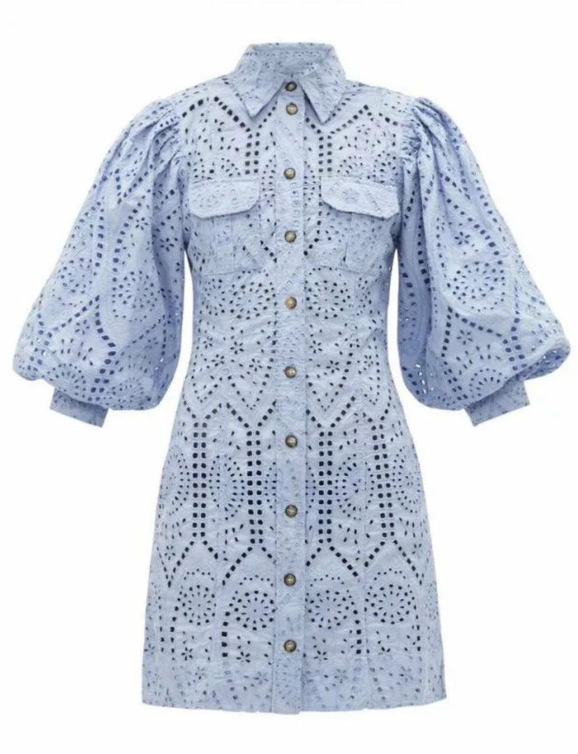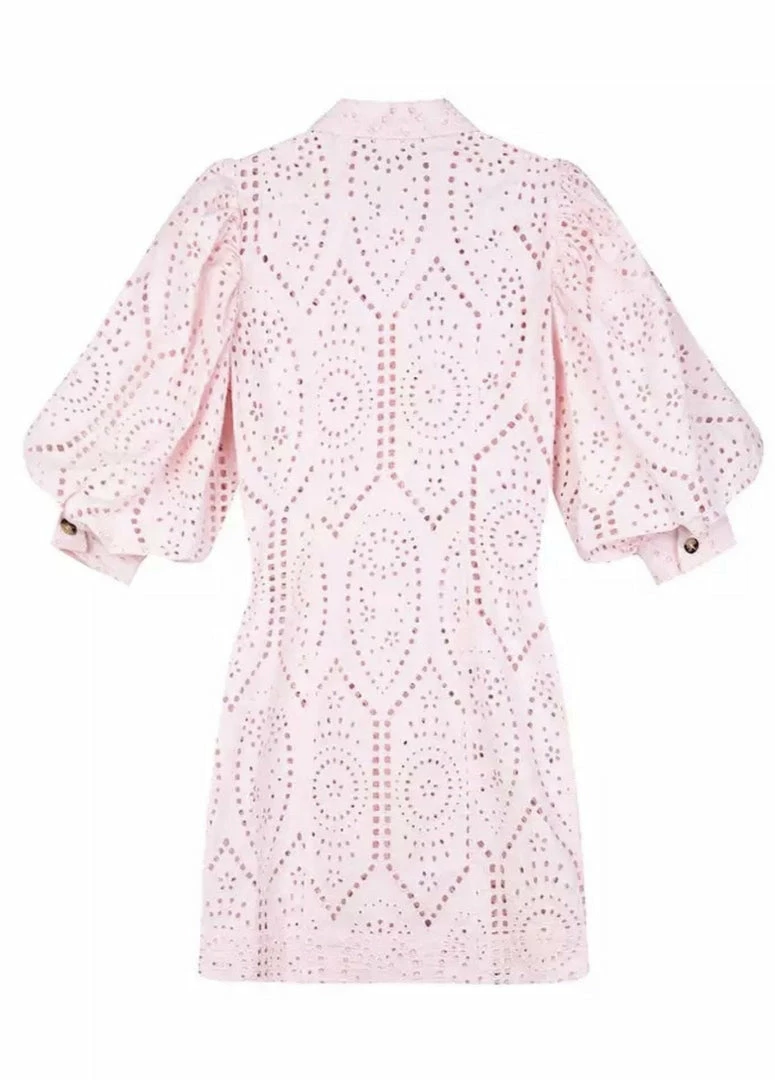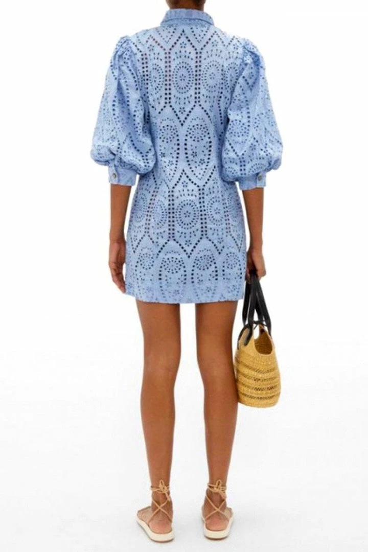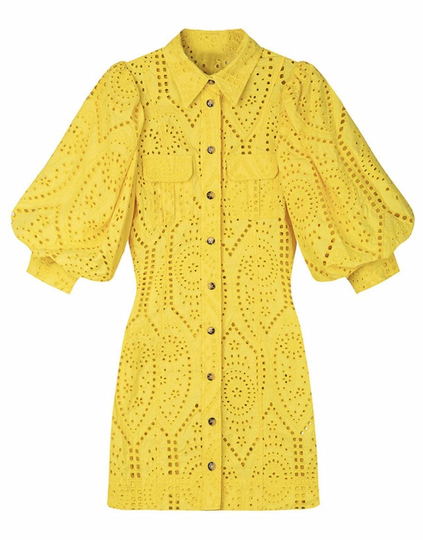 The perfect summertime dress! Featuring an eyelet material, short sleeves, collar detail, buttons down the front, and a mini length. Pair with wedges and a cute mini bag.
