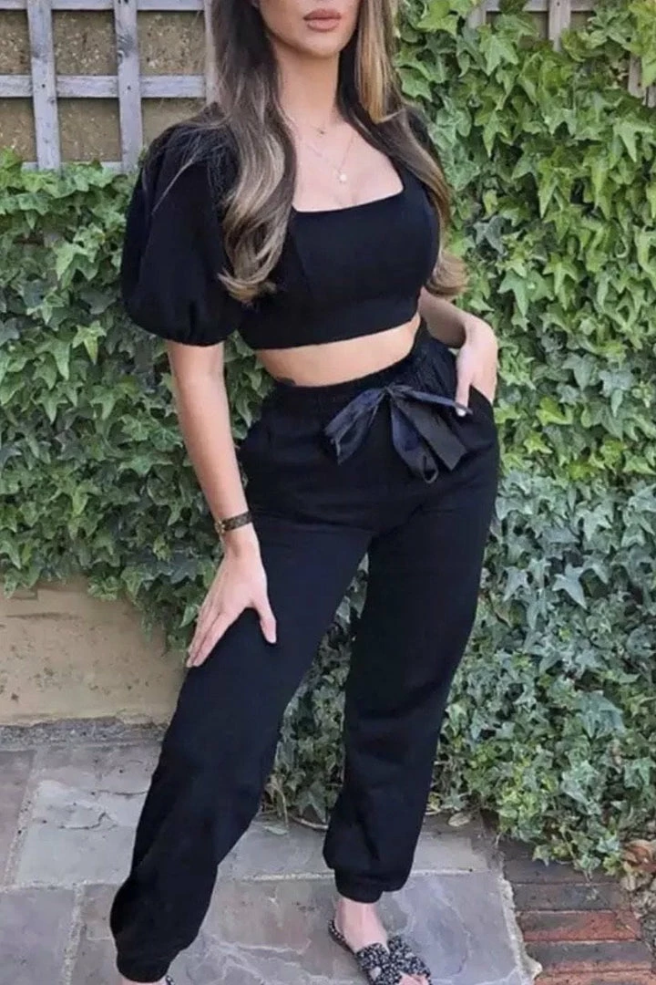 Your new fave lounge set! Featuring a cropped short sleeve top with puff sleeves, and matching high waisted joggers with a ribbon bow detail. Pair with white sneakers for a cute everyday look.