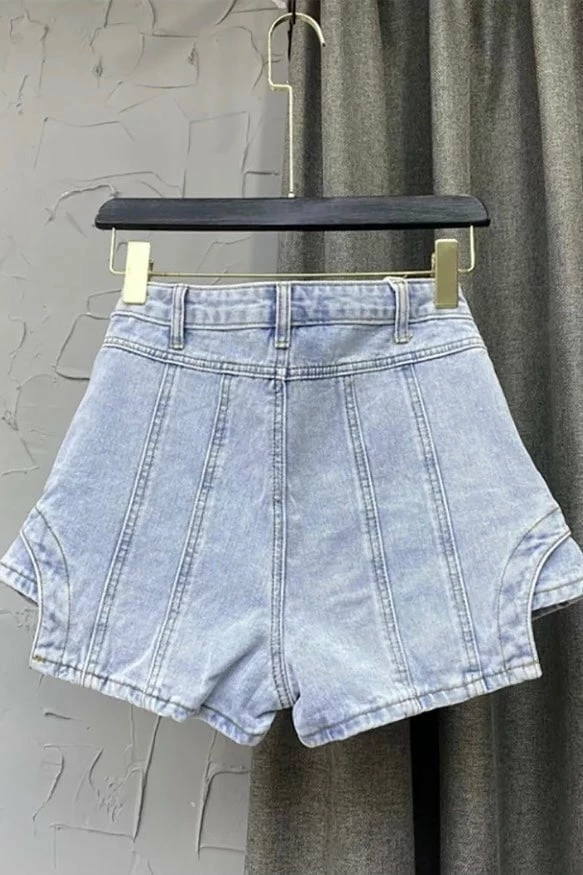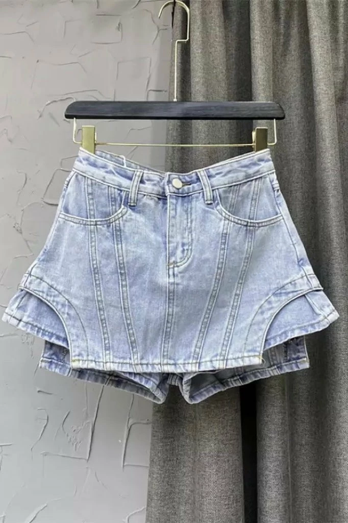 Go for the denim darling look this season. Featuring a high waisted denim skort with an irregular cut and built in shorts underneath. Style with a basic tank and sandals to complete the look.