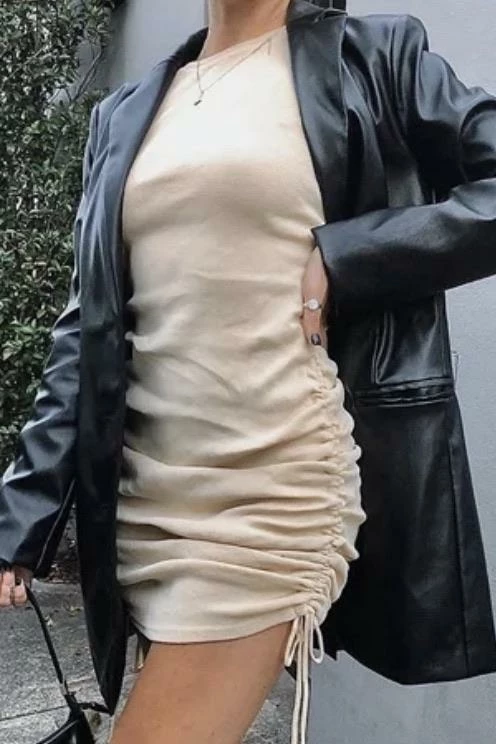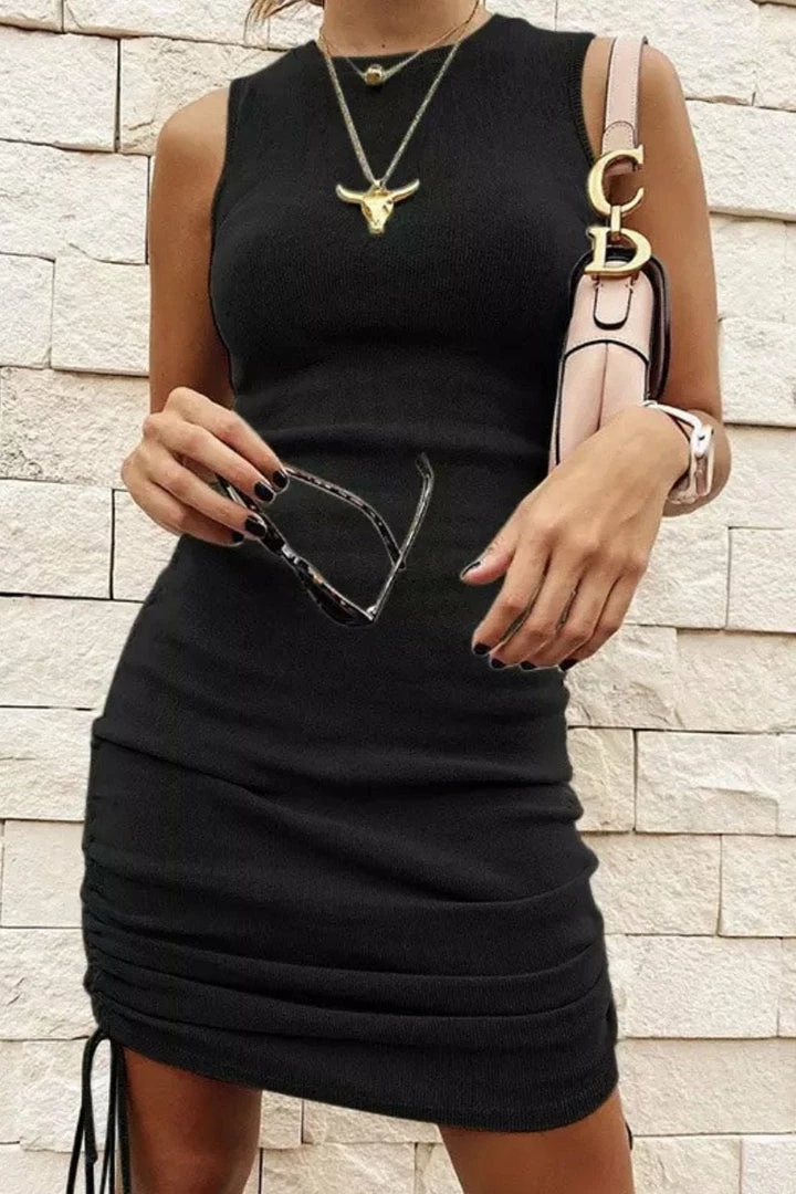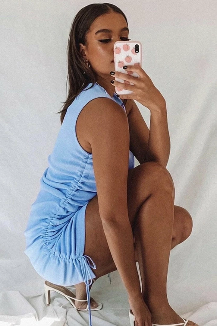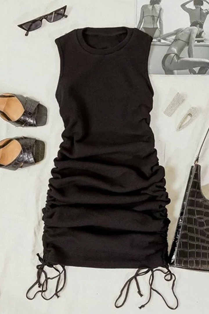 Your new go-to piece! Featuring a sleeveless style, ribbed material, tie and ruched details, and a mini length. Pair with cute sunnies and sneakers for a chic everyday look!