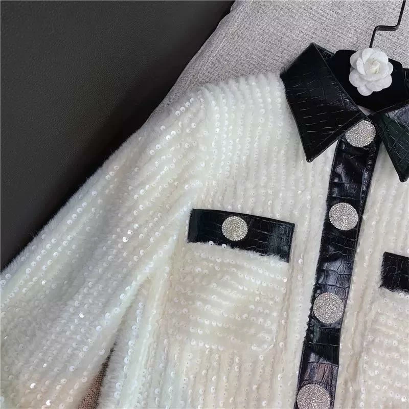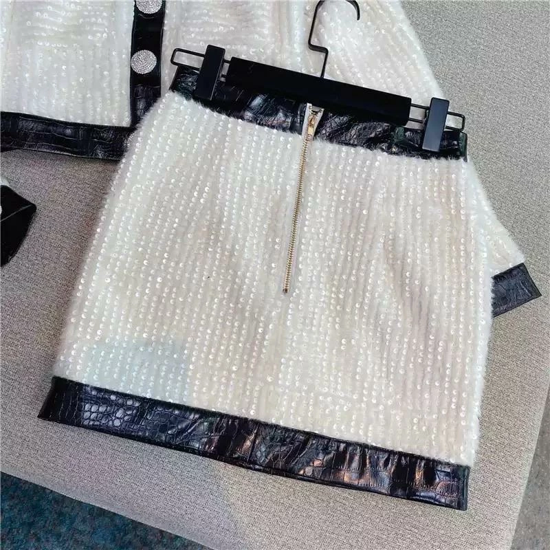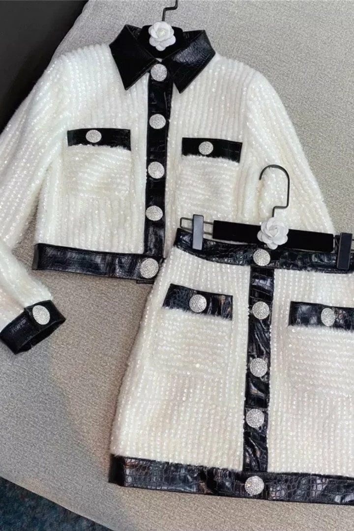 This two piece set is everything we’re loving this season. Featuring a matching blazer and high waisted skirt set with white sequins, croc material lining, and diamond decorated buttons. Pair with a leather hat and thigh high boots for a look no one will want to forget!