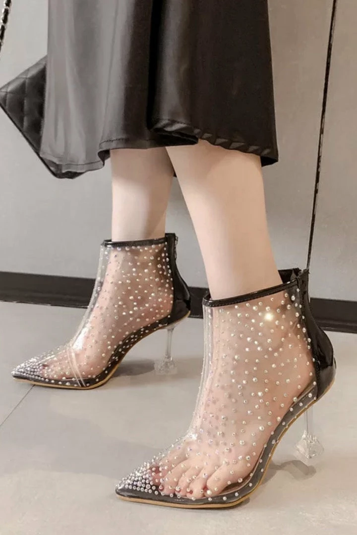 Add some fun into your shoe wardrobe with these stunners! Featuring a bootie style, clear material, rhinestone details, and pointed toe.