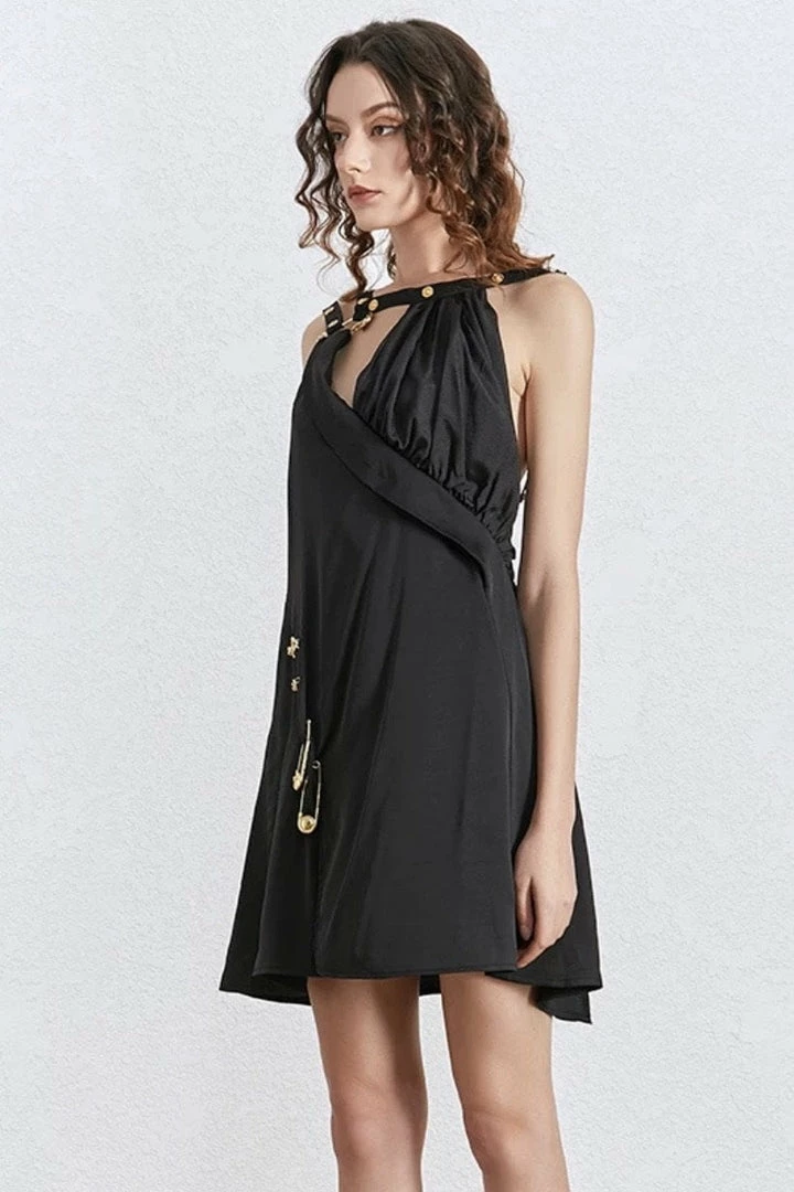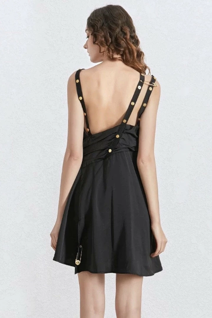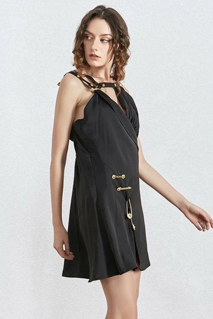 Update your LBD game with our ‘Josie’ dress! Featuring gold pin embellishments, v-neck detail, spaghetti straps, and a mini length.