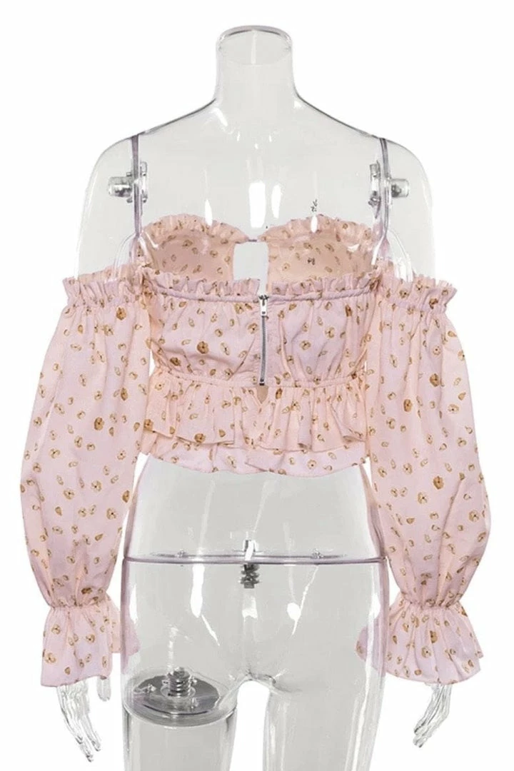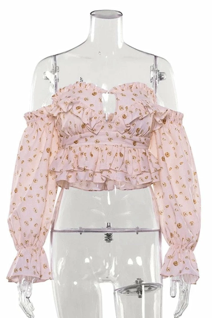 Win all the stares in this super cute top! Featuring a floral printed material, off the shoulder style, v neck, ruffle details, and a cropped length.
