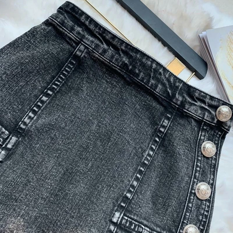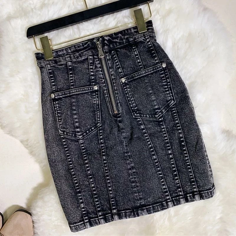 Look super chic in this adorable mini. Featuring a denim material, high waisted fit, button embellishment details, bodycon fit, and a mini length. Pair with a bodysuit and heels for a cute date night look!