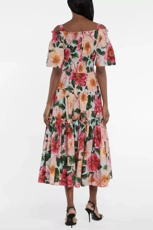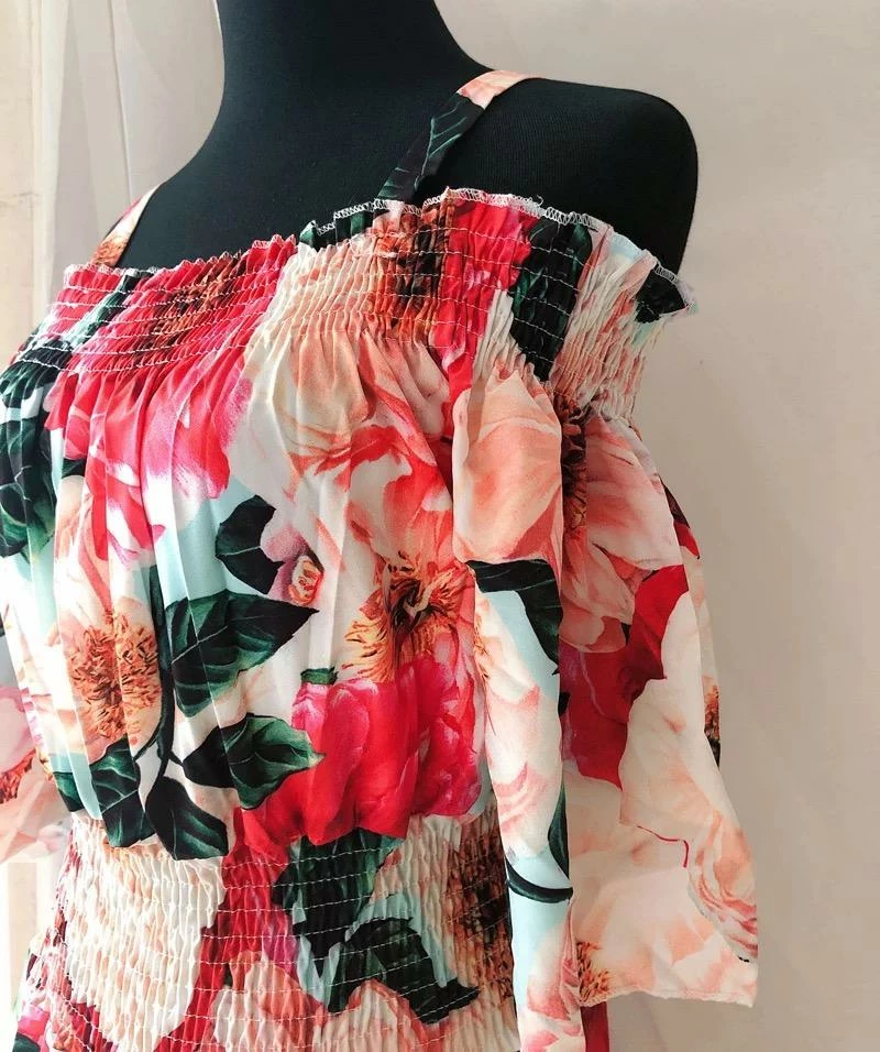 A sundress style we are swooning over! Featuring a off the shoulder with spaghetti strap style, floral design, maxi length, and ribbed waist material. Pair with sandals and a wicker tote for a date to the park or running around a beach town.