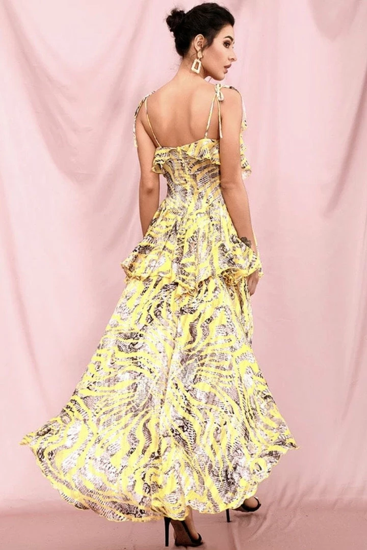 Make a bold statement in this high-low dress! Featuring a yellow printed material, spaghetti straps, and ruffle details. Pair with nude heels and statement earrings.