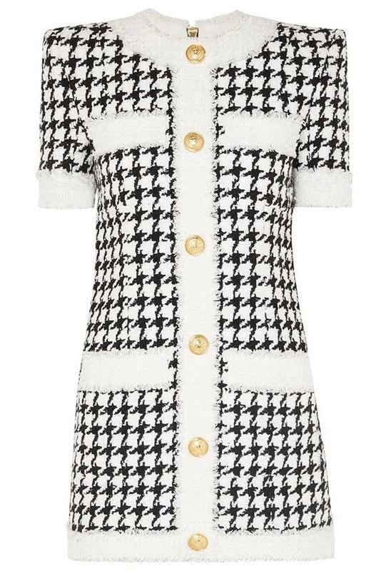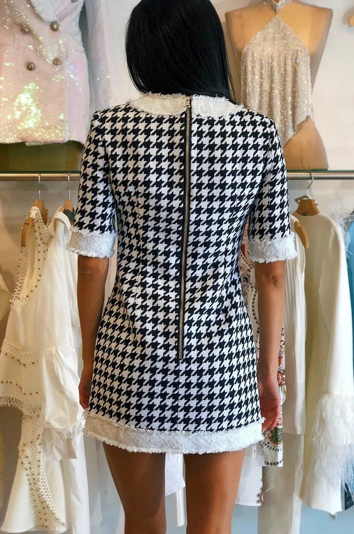 Cater to all of your desk to dinner needs in our ‘Kaitlyn’ dress. Including a houndstooth pattern, a cotton/polyester material, zipper back closure, mini length, and gold button embellishments