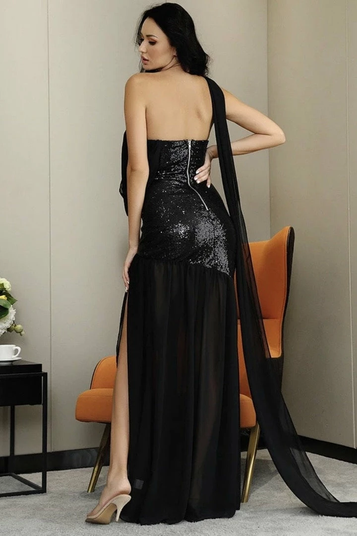 Look like a princess at your next event in this jaw-dropping piece. Featuring a sequin and chiffon material, draped shoulder details, bodycon fit, and a floor length.