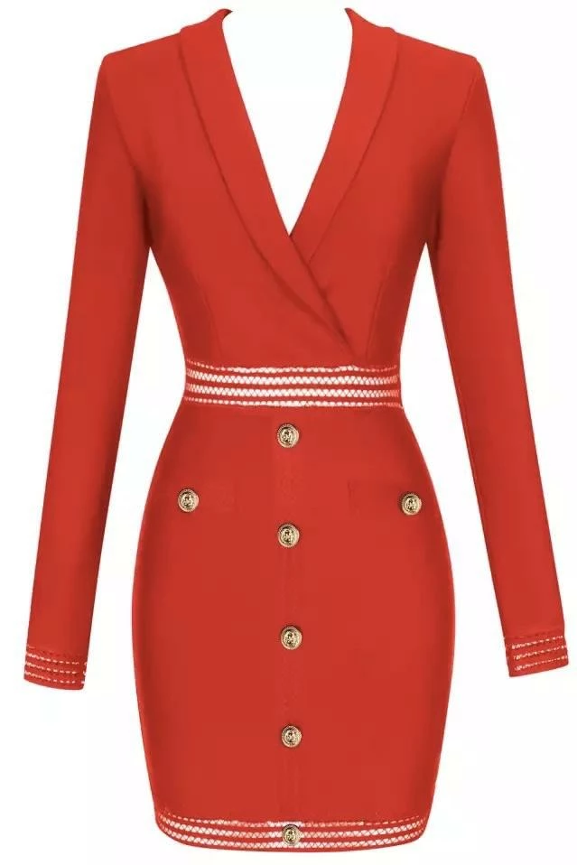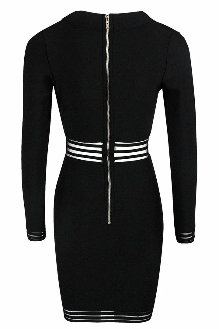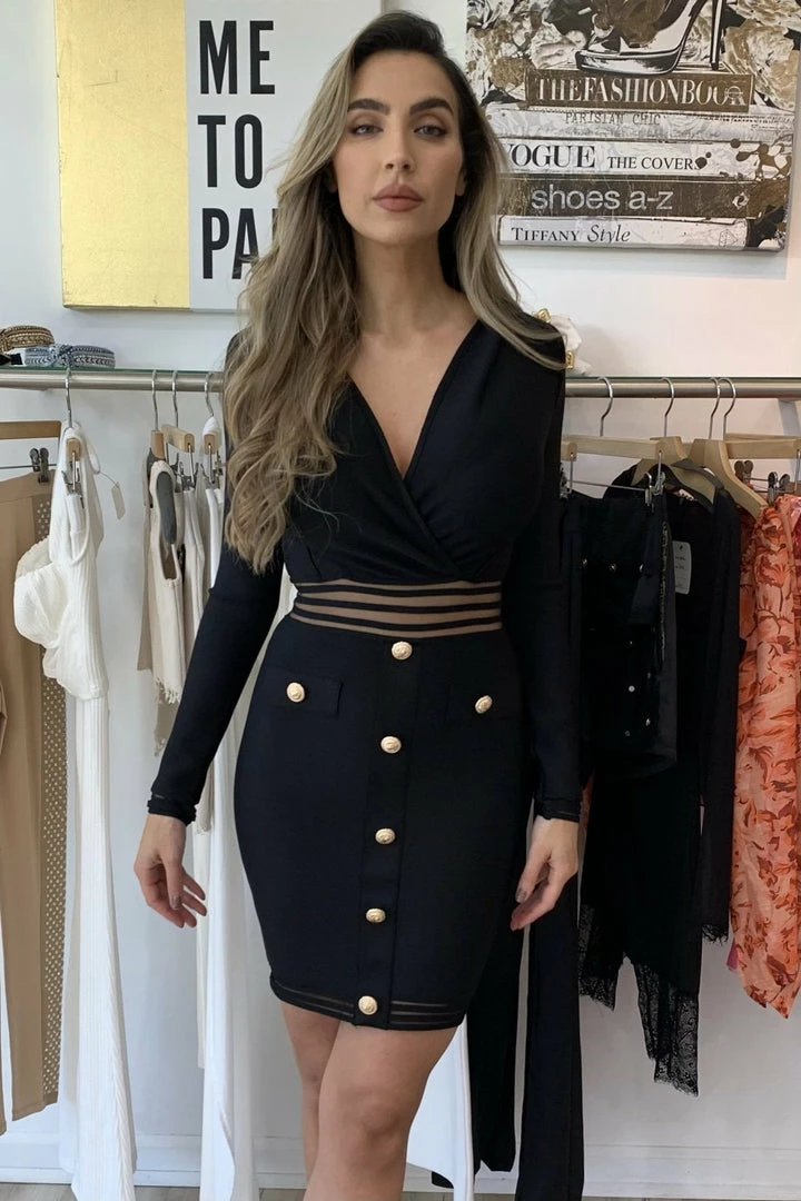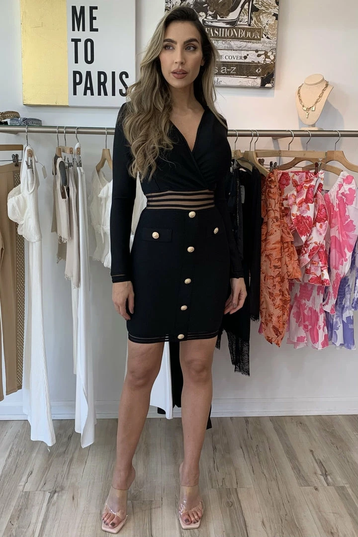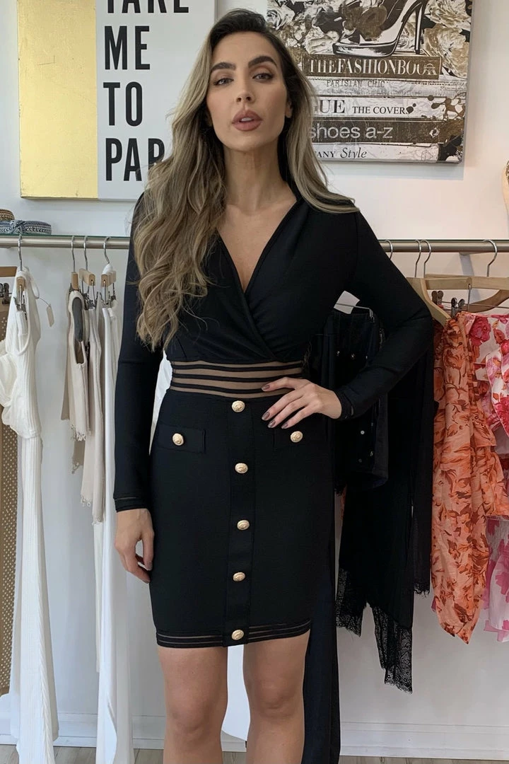 This dress is made for a boss babe! Featuring a long sleeve, bandage mini dress with silver or gold button detailing, a mesh, lined cut out design across the torso and hems, and a slight v neck. From brunch, to meetings, or all night in the bar you’re sure to look like a babe!