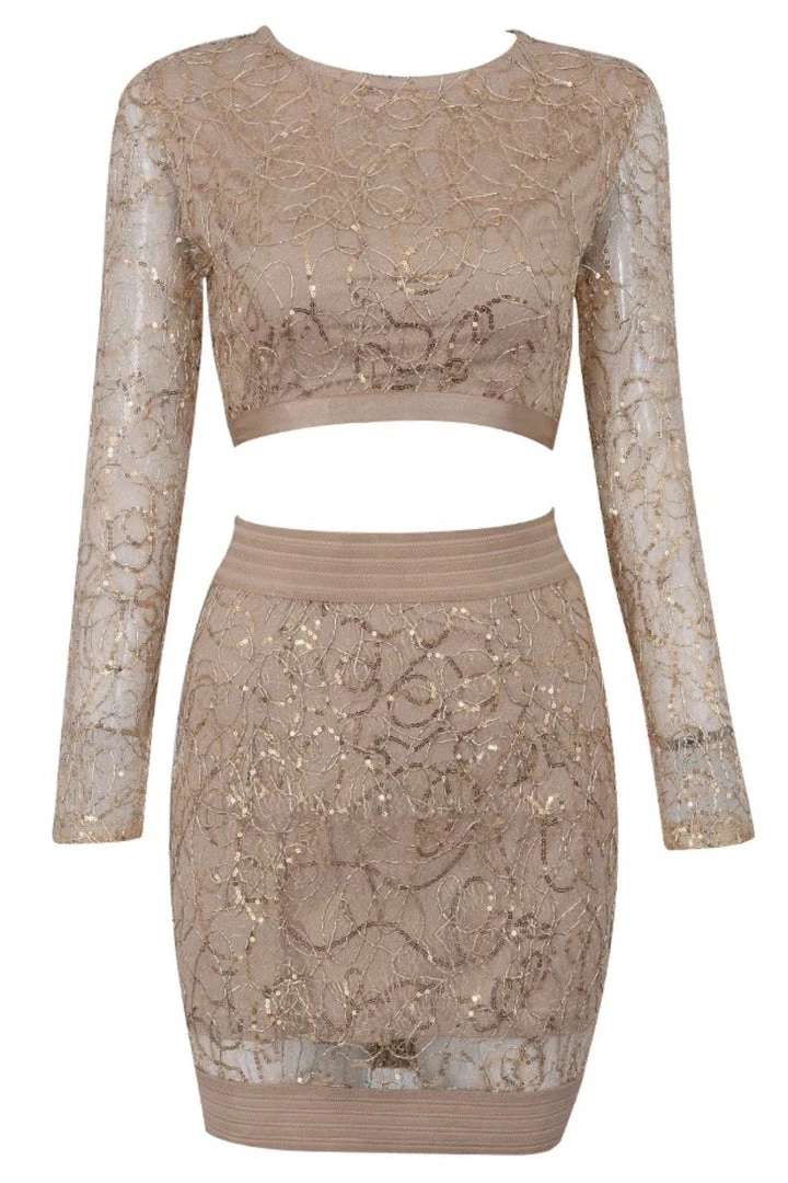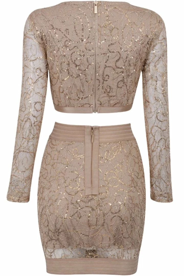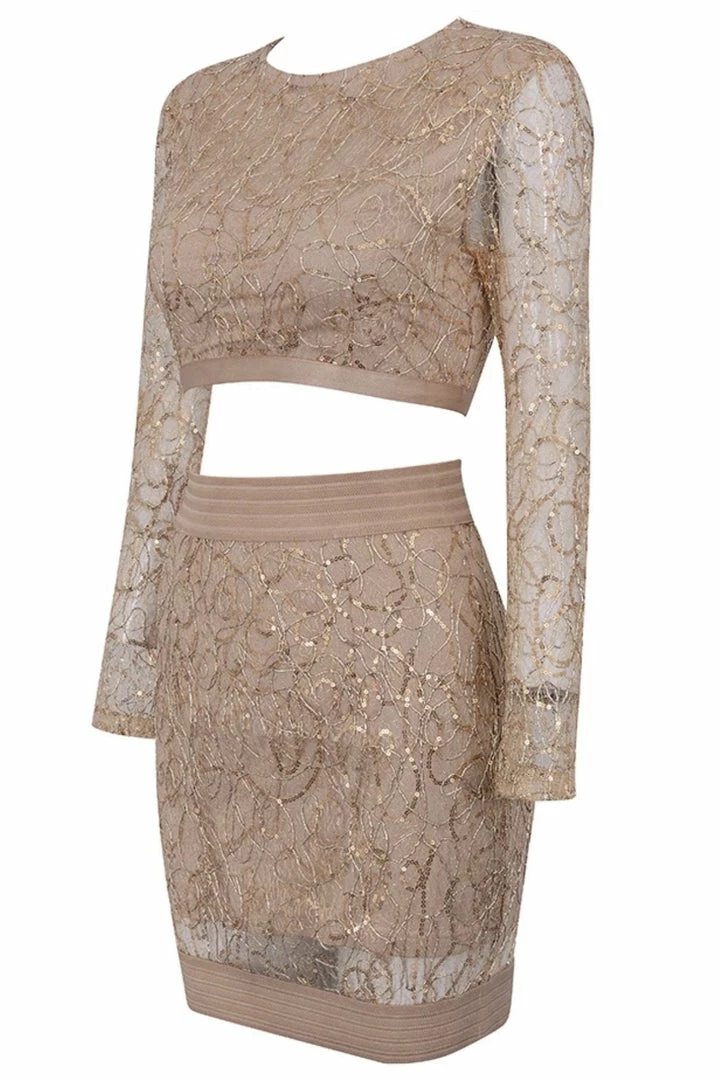 Perfect for your next night out! This two piece set features a long sleeve cropped top with gold sequin details and a matching high-waisted mini skirt. Pair with tousled waves and a red lip.