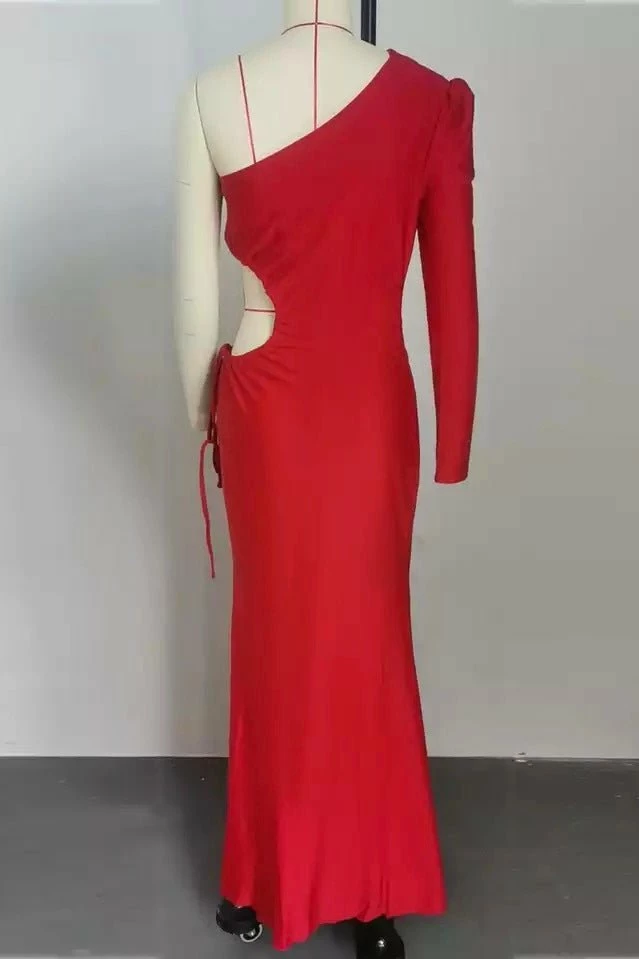 Dare to be different in this unique yet stunning gown! Featuring a fit-and-flare style, one shoulder detail and cut out design. Pair with silver or gold stilettos for a sexy look.