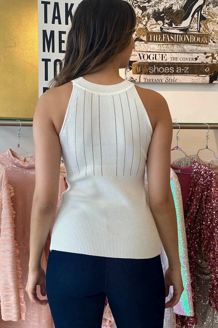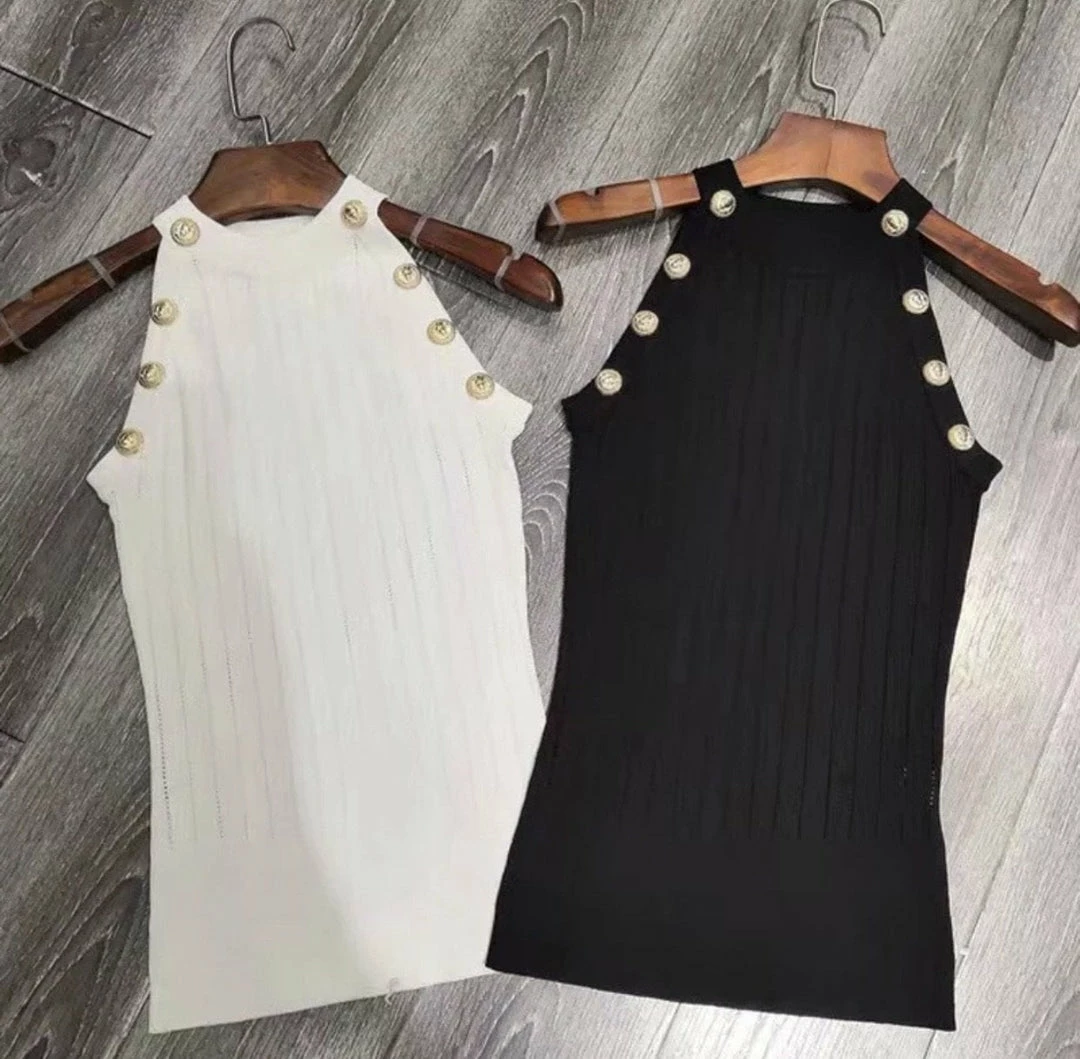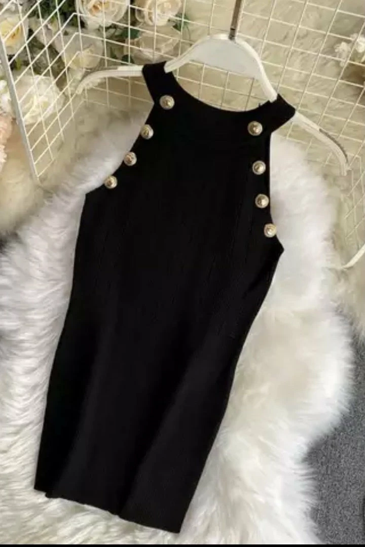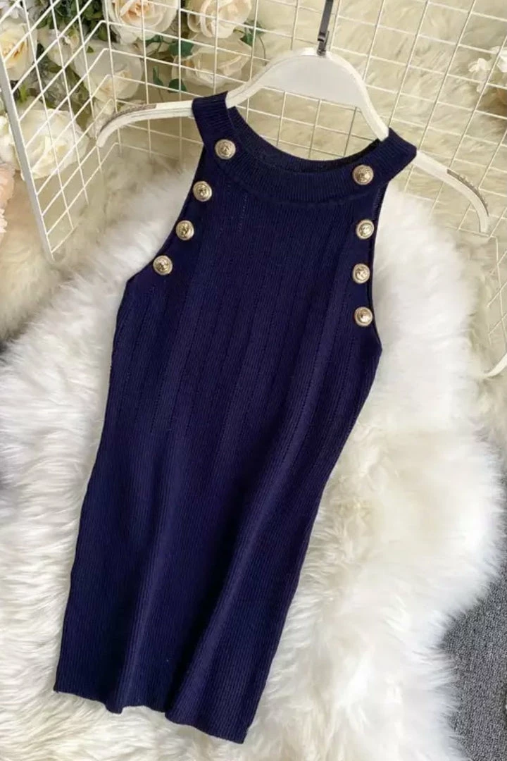Make any look more chic in this tank! Featuring a high neckline, gold button embellishments, and a knit material. Pair with shorts and heels for an easy date night look.