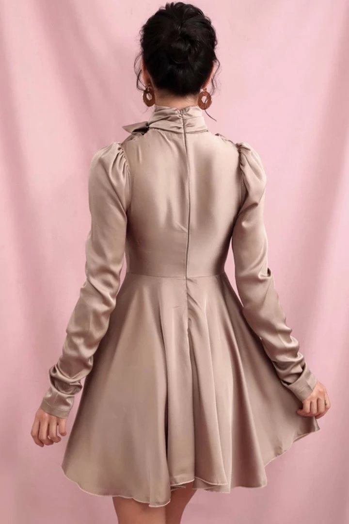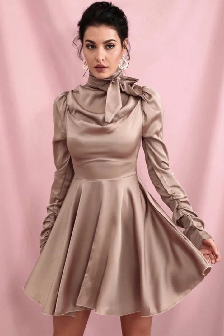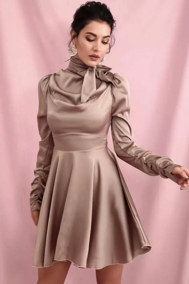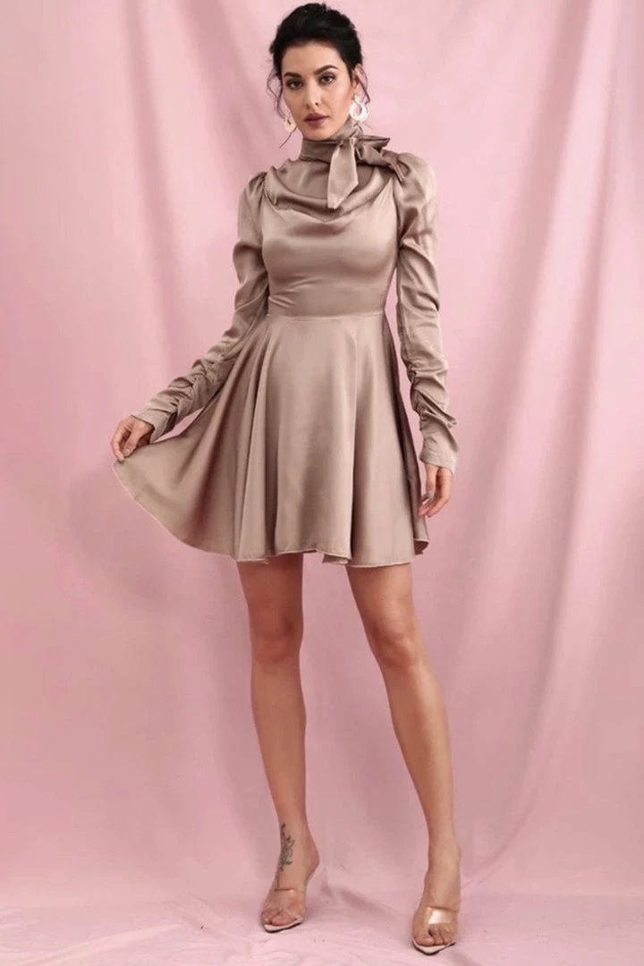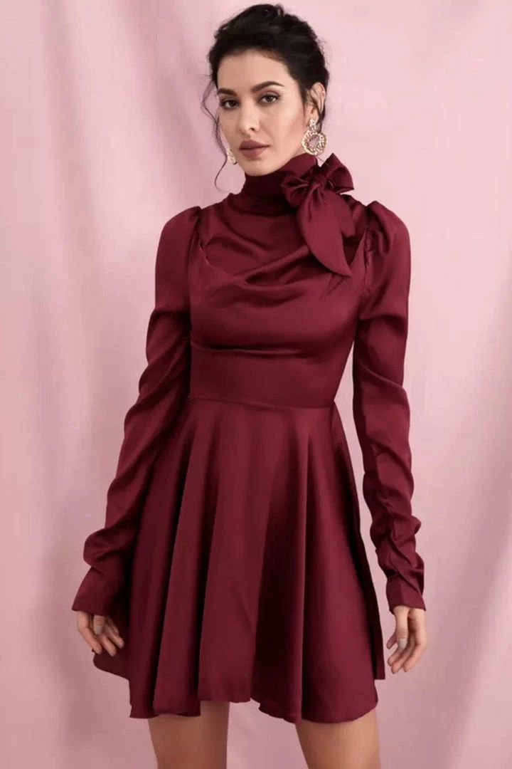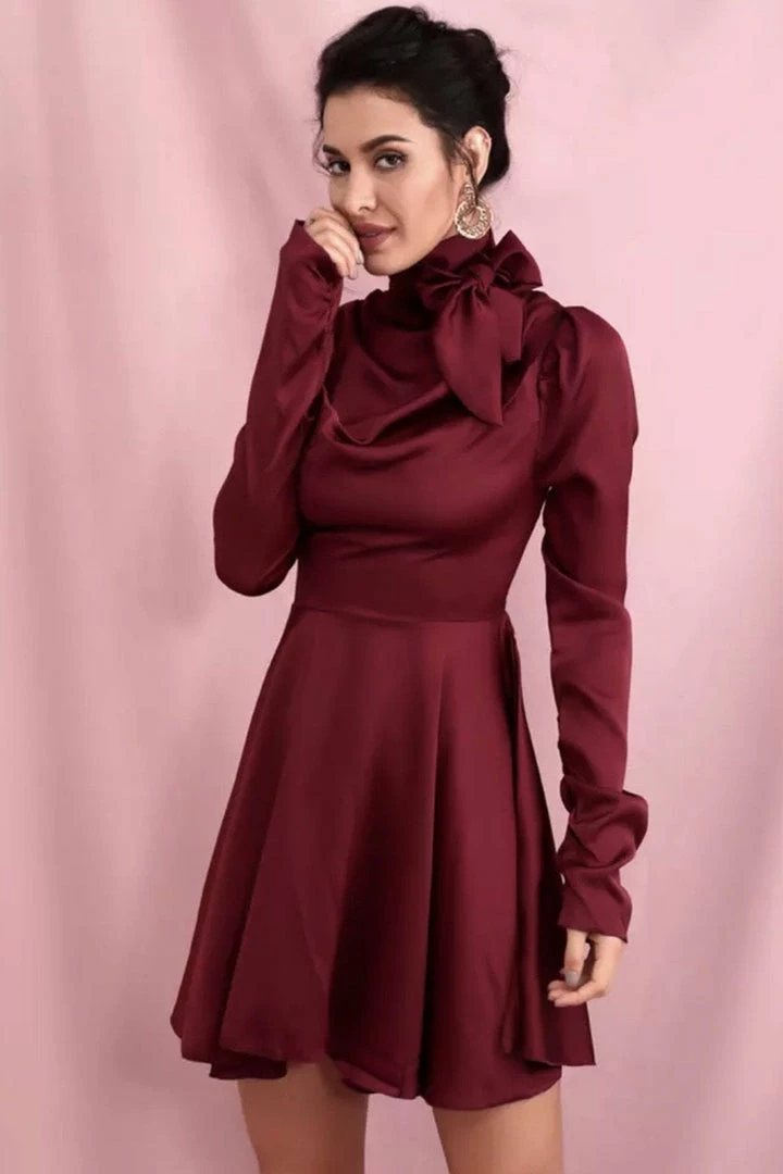 Go for a chic and timeless look in this mini. Featuring a silky material, long sleeves, high neckline, bow detail, a-line fit, and mini length. Pair with stilettos and a sleek ponytail.