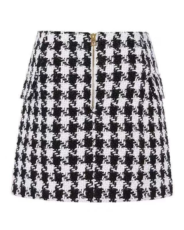 Look chic this season in our mini ‘Kinley’! Featuring a houndstooth material, gold embellishments, pockets, and a mini length. Pair with a cozy sweater and over the knee boots.
